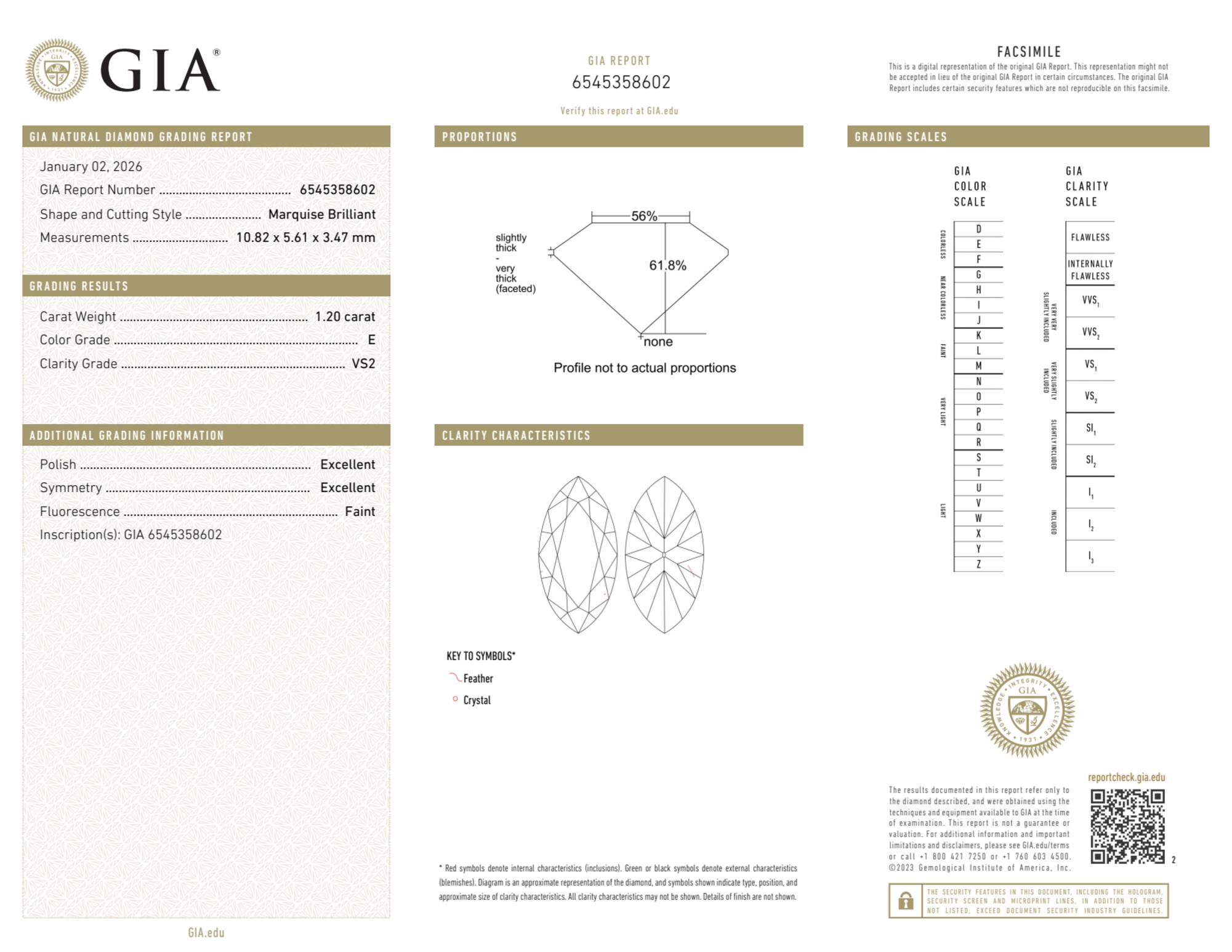 Your 1.20 carat Marquise natural diamond is graded VS2 clarity, which stands for Very Slightly Included 2. Read more about VS2 clarity diamonds here, or learn more about diamond clarity in general here.