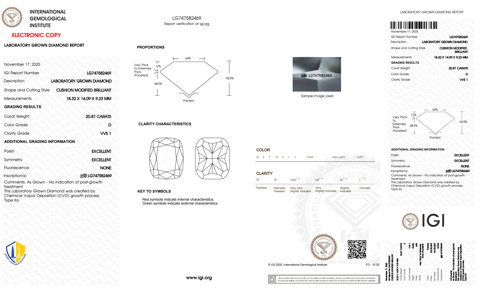 Your 20.87 carat Cushion lab diamond is graded D color (Colorless), and you can read more about D color diamonds here.