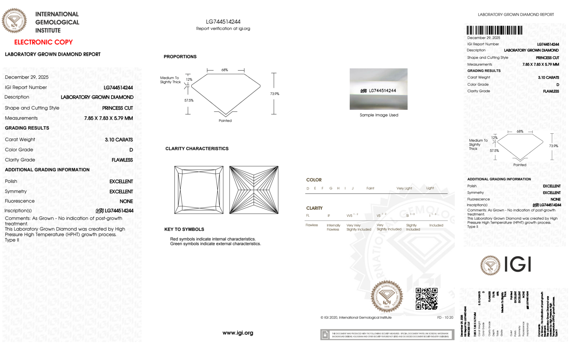 Your 3.10 carat Princess lab diamond is graded FL clarity, which stands for Flawless. Read more about FL clarity diamonds here, or learn more about diamond clarity in general here.