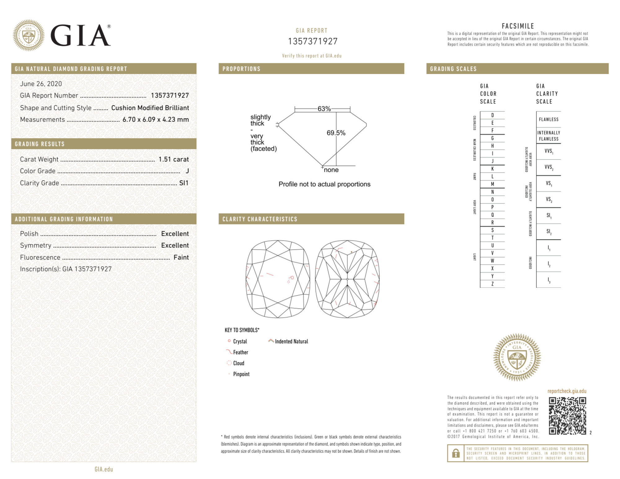 Your 1.51 carat Cushion natural diamond is graded J color (Near Colorless), and you can read more about J color diamonds here.