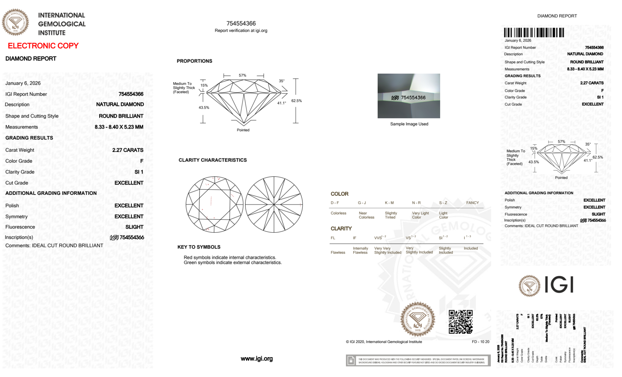 Your 2.27 carat Round natural diamond is graded F color (Colorless), and you can read more about F color diamonds here.