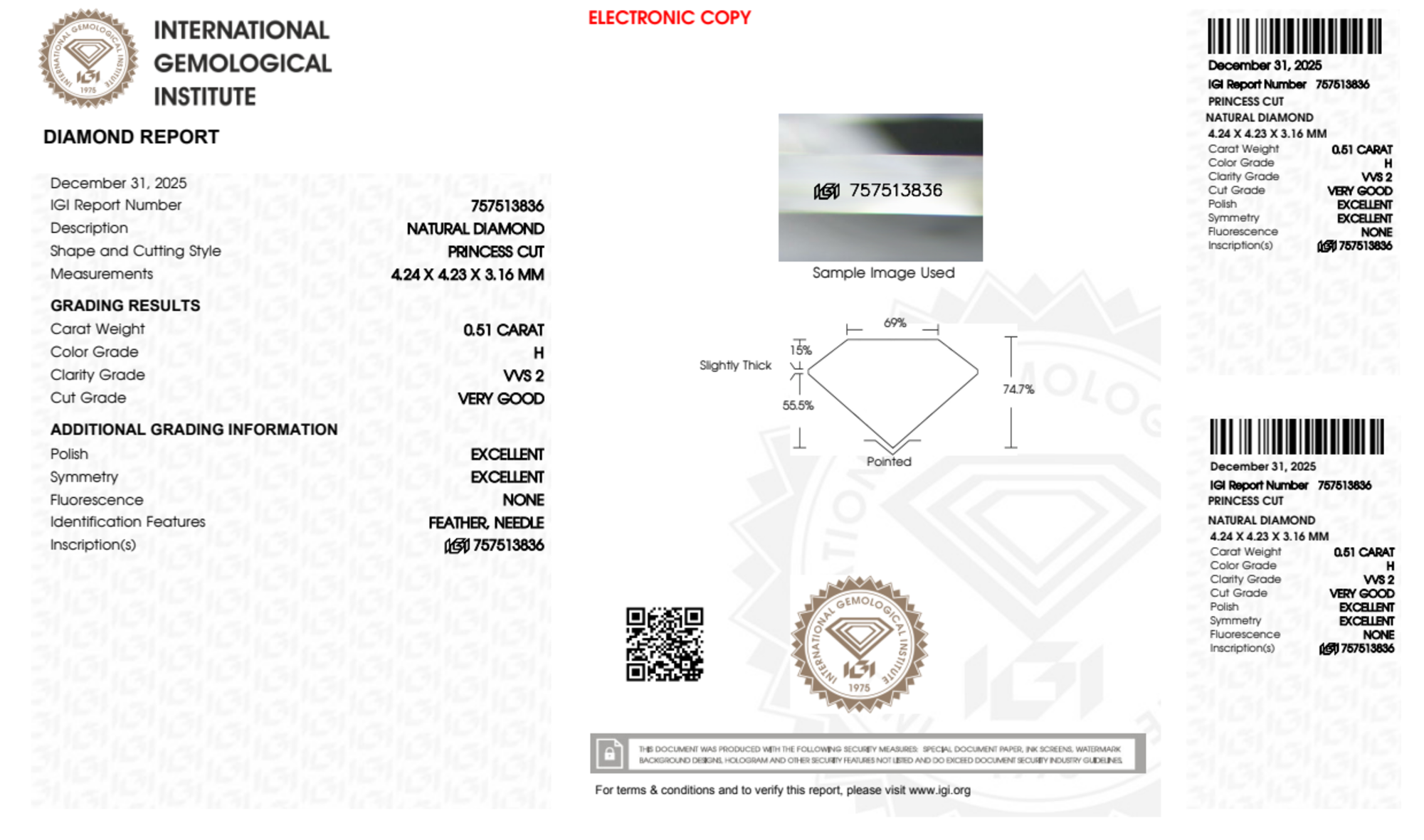 Your 0.51 carat Princess natural diamond is graded VVS2 clarity, which stands for Very Very Slightly Included 2. Read more about VVS2 clarity diamonds here, or learn more about diamond clarity in general here.