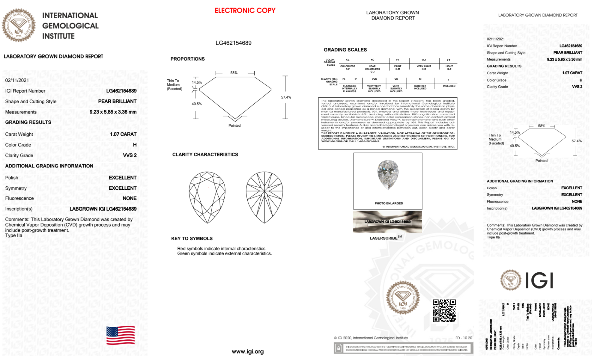 Your 1.07 carat Pear lab diamond is graded H color (Near Colorless), and you can read more about H color diamonds here.