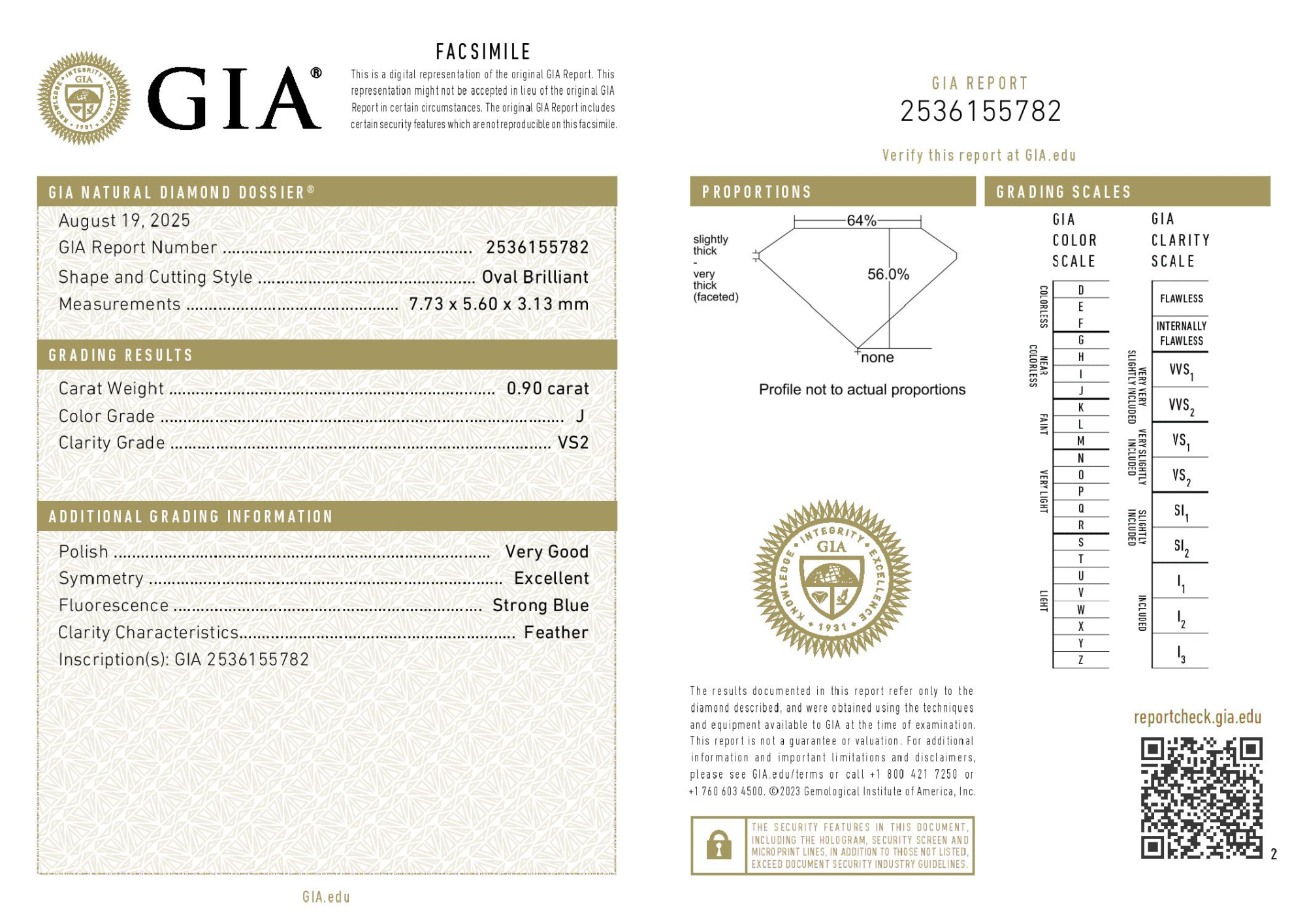 Your 0.90 carat Oval natural diamond is graded VS2 clarity, which stands for Very Slightly Included 2. Read more about VS2 clarity diamonds here, or learn more about diamond clarity in general here.