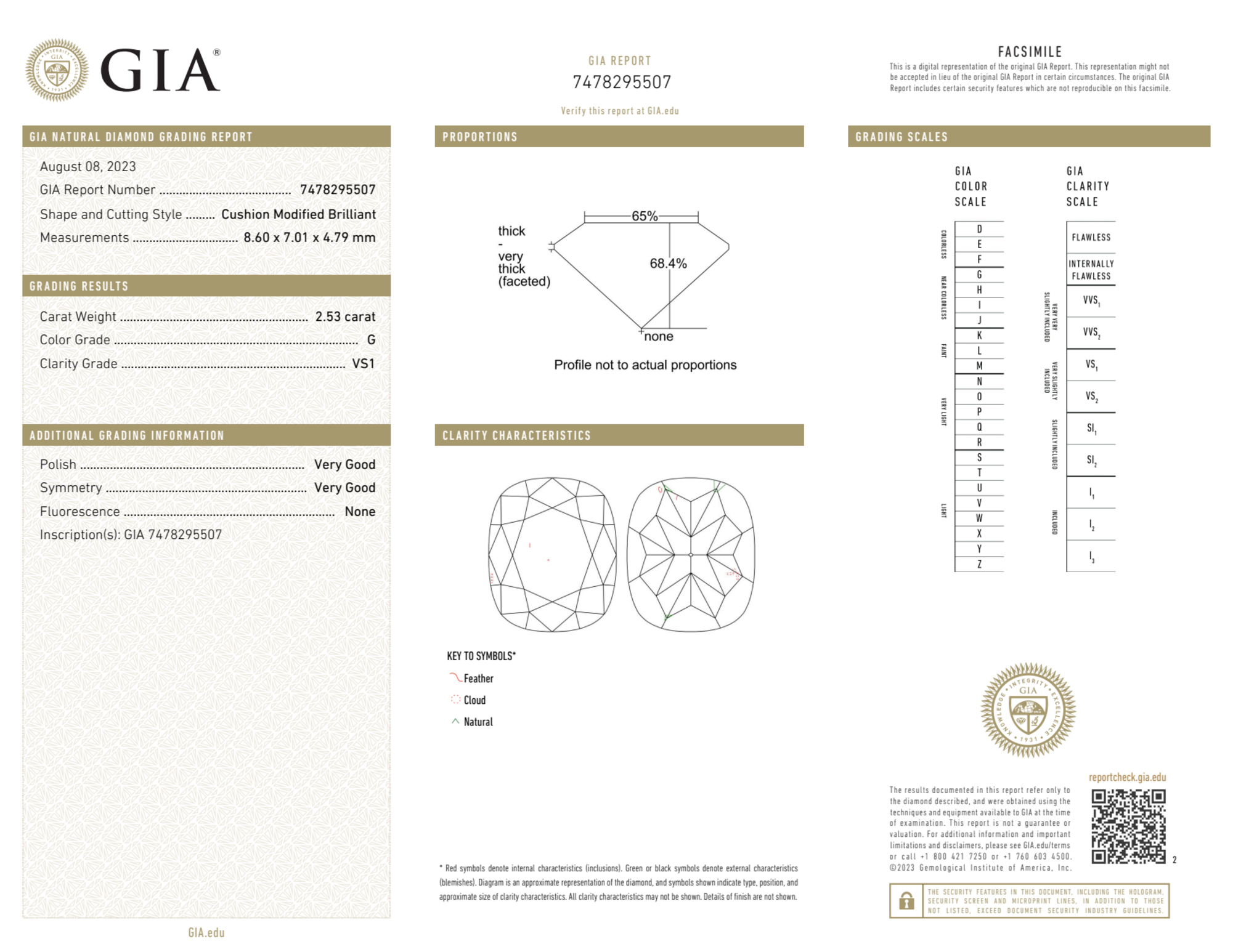 Your 2.53 carat Cushion natural diamond is graded G color (Near Colorless), and you can read more about G color diamonds here.