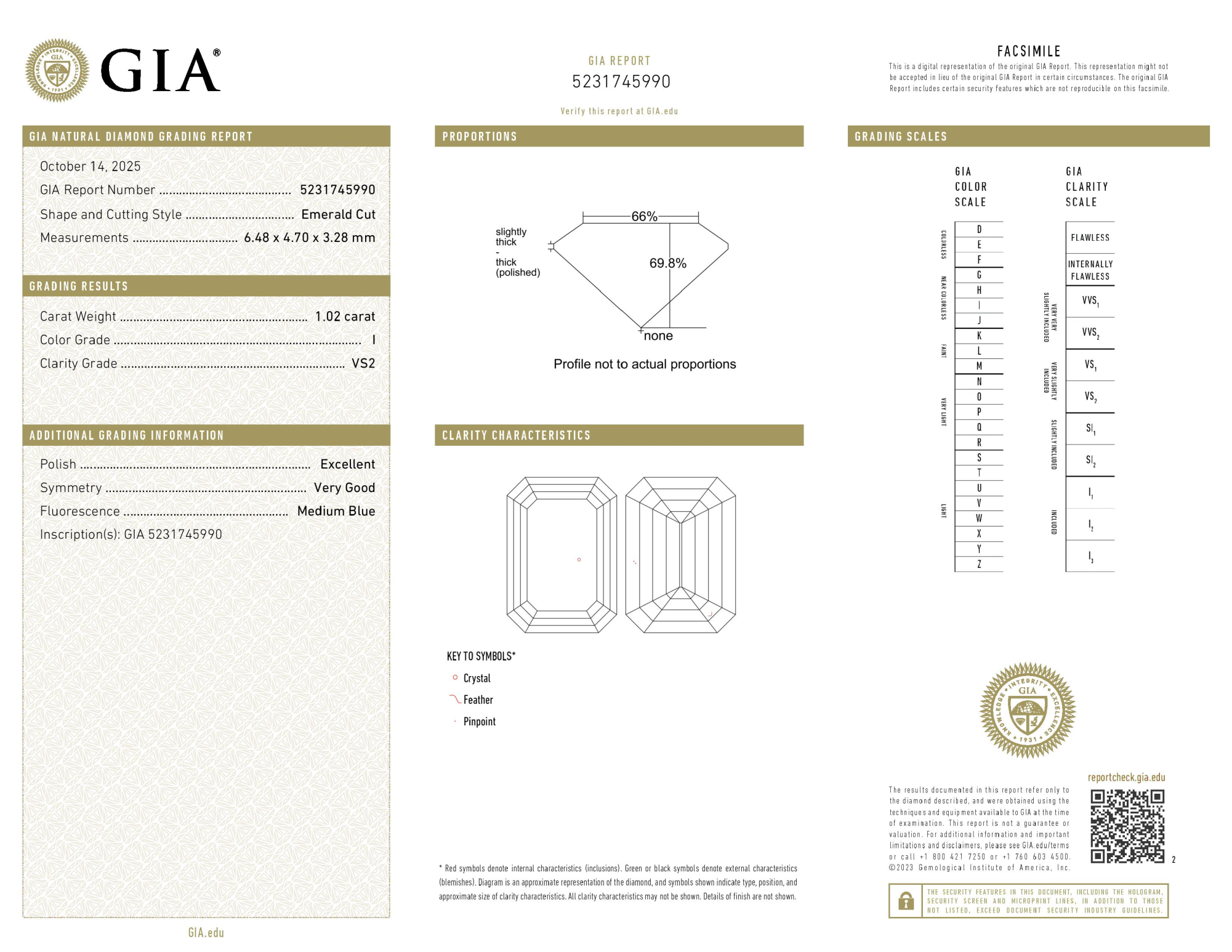 Your 1.02 carat Emerald natural diamond is graded VS2 clarity, which stands for Very Slightly Included 2. Read more about VS2 clarity diamonds here, or learn more about diamond clarity in general here.