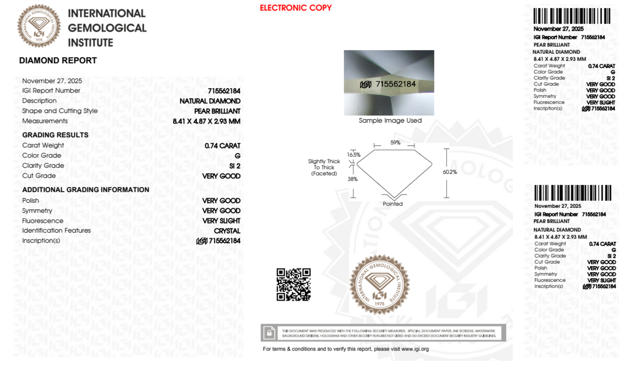 Your 0.74 carat Pear natural diamond is graded SI2 clarity, which stands for Slightly Included 2. Read more about SI2 clarity diamonds here, or learn more about diamond clarity in general here.