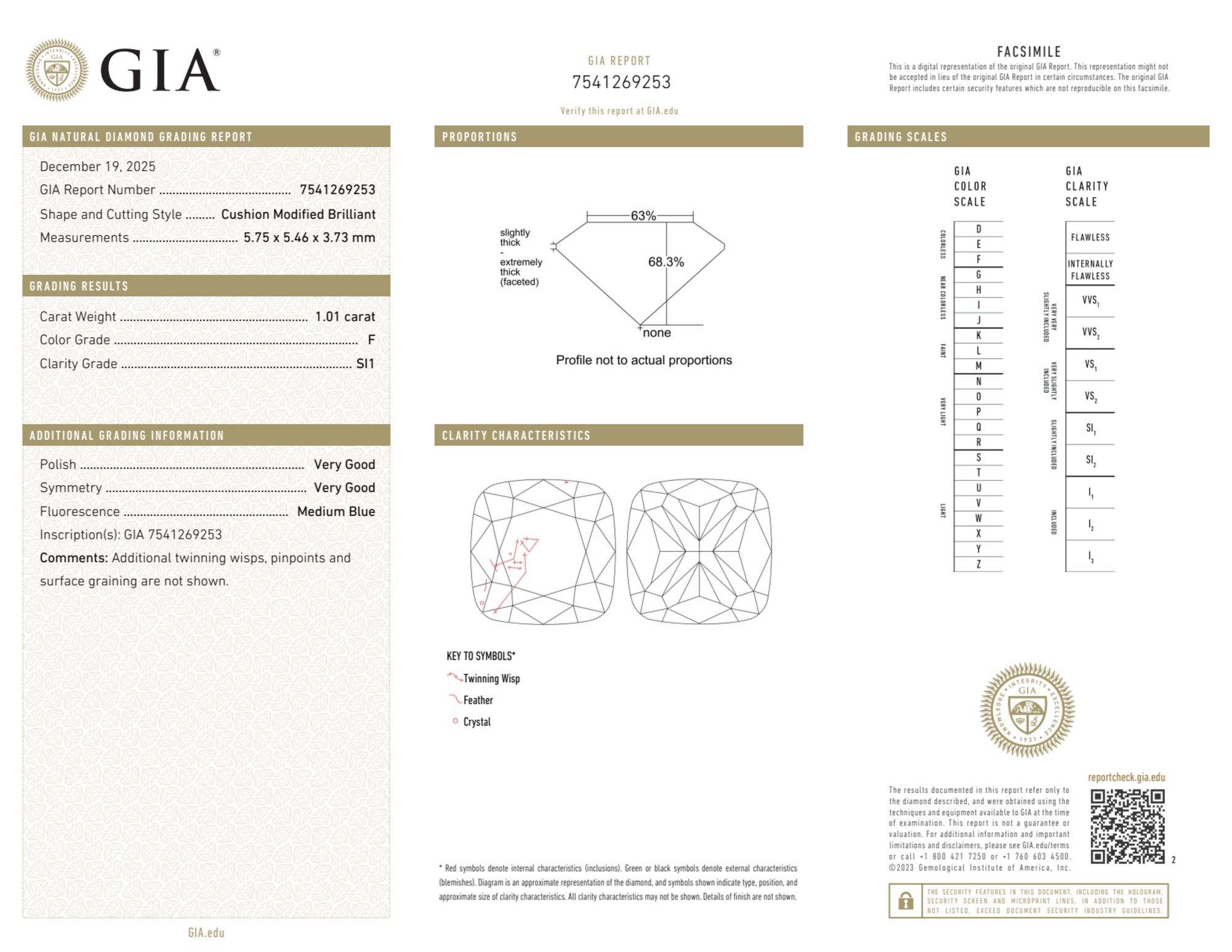 Your 1.01 carat Cushion natural diamond is graded F color (Colorless), and you can read more about F color diamonds here.