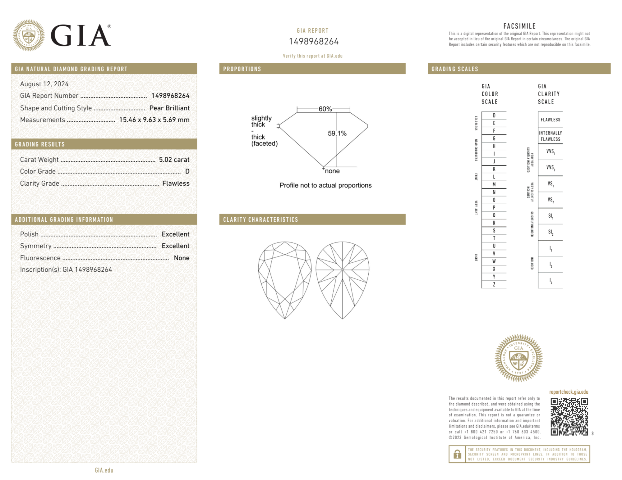 Your 5.02 carat Pear natural diamond is graded D color (Colorless), and you can read more about D color diamonds here.