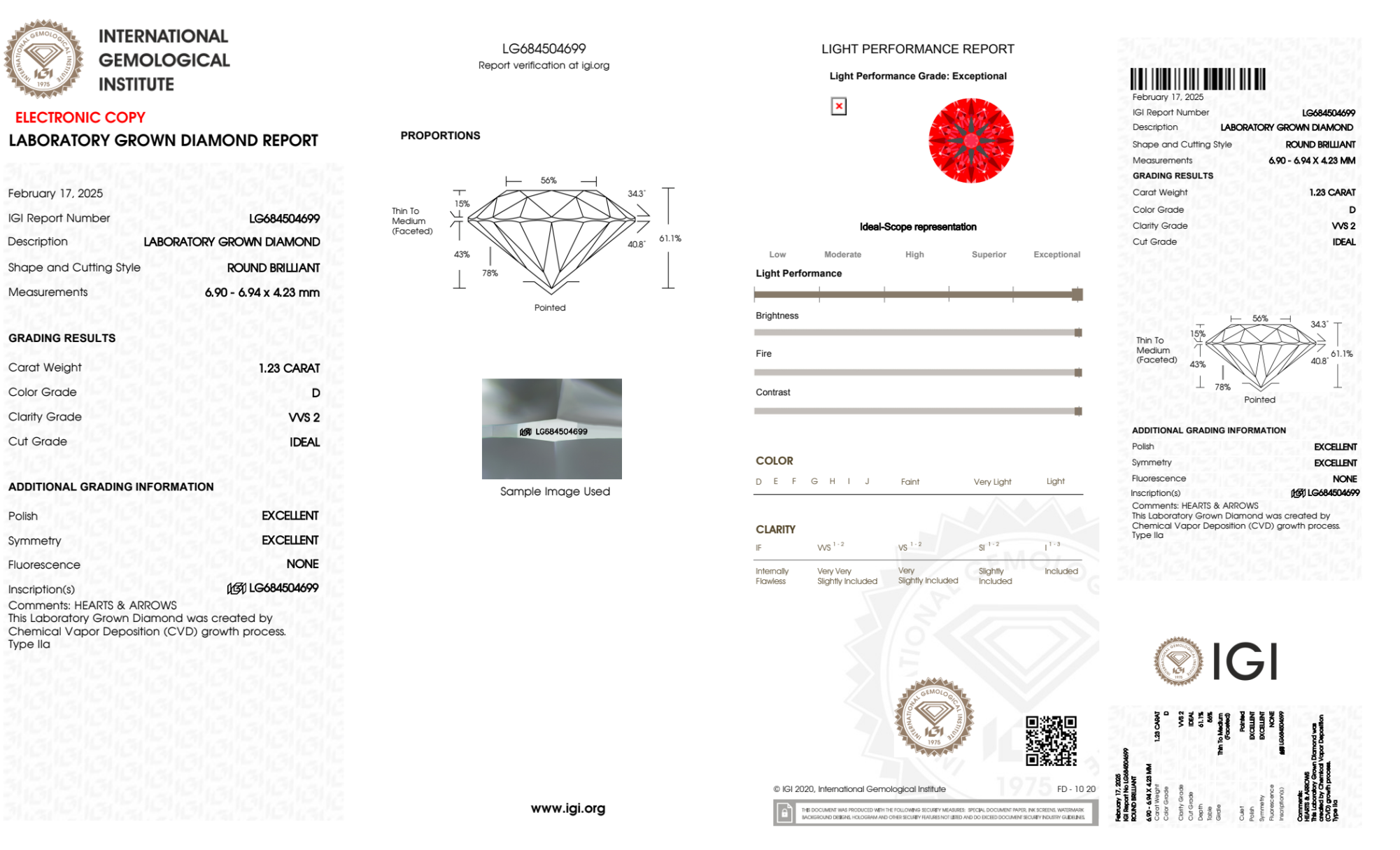Your 1.23 carat Round lab diamond is graded D color (Colorless), and you can read more about D color diamonds here.