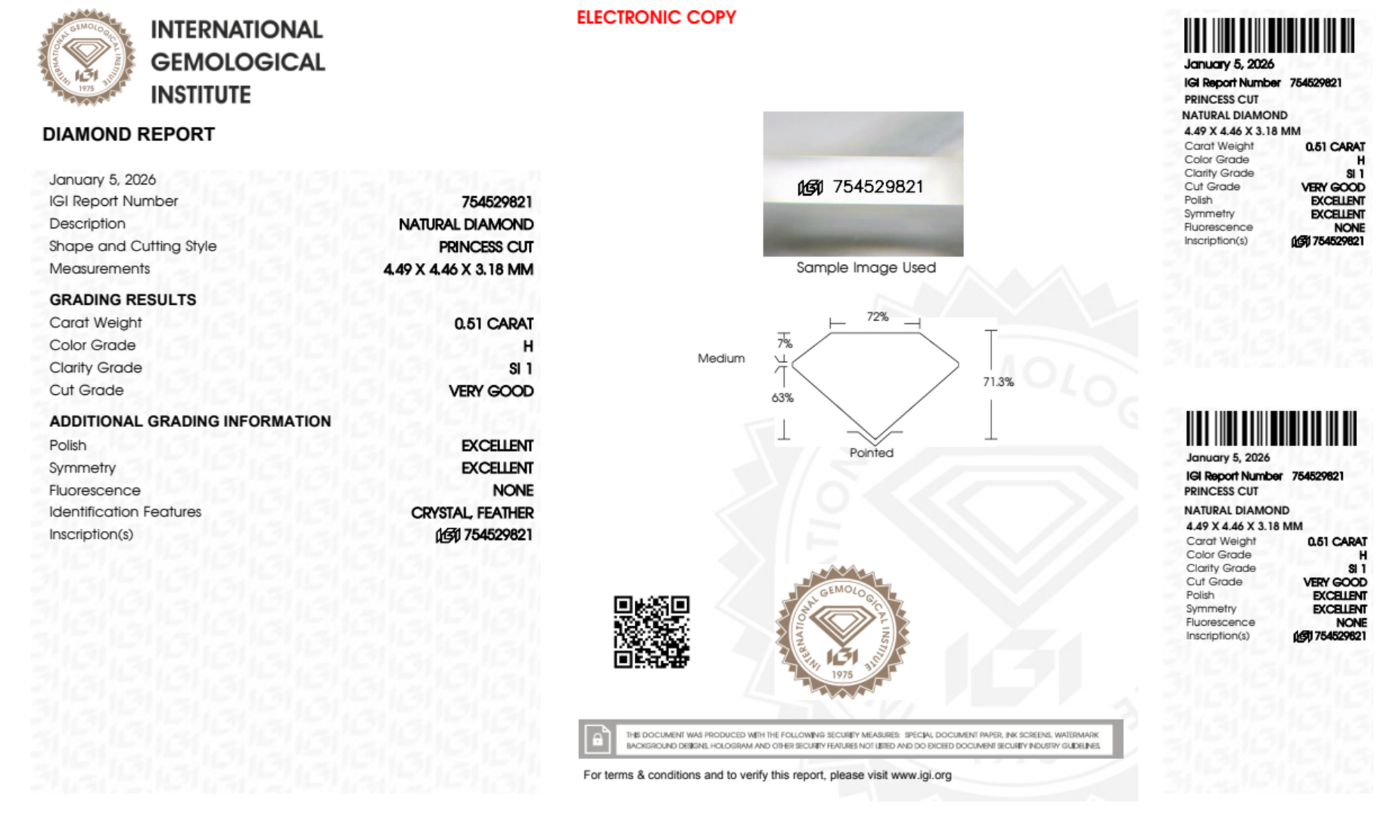 Your 0.51 carat Princess natural diamond is graded SI1 clarity, which stands for Slightly Included 1. Read more about SI1 clarity diamonds here, or learn more about diamond clarity in general here.