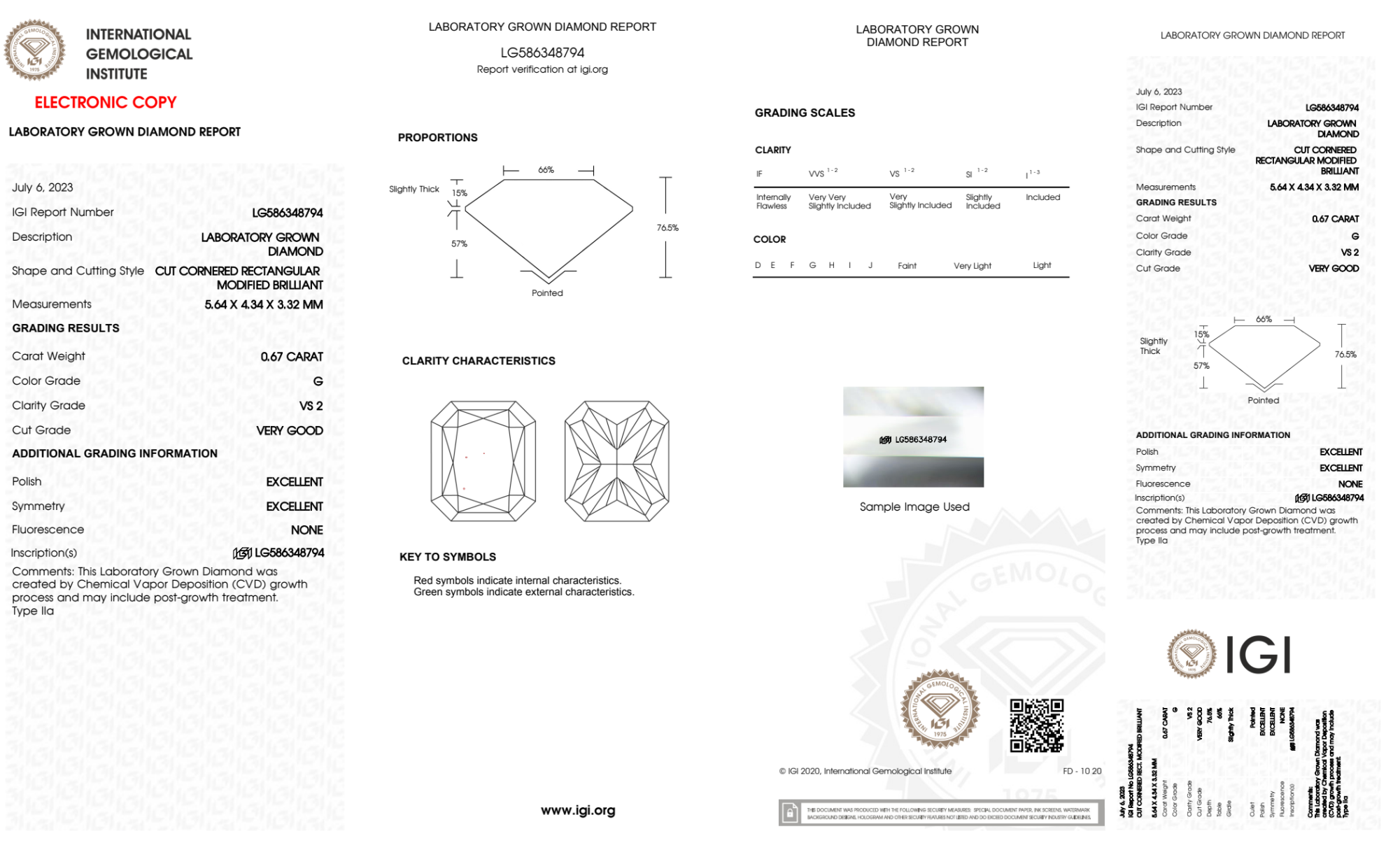 Your 0.67 carat Radiant lab diamond is graded G color (Near Colorless), and you can read more about G color diamonds here.