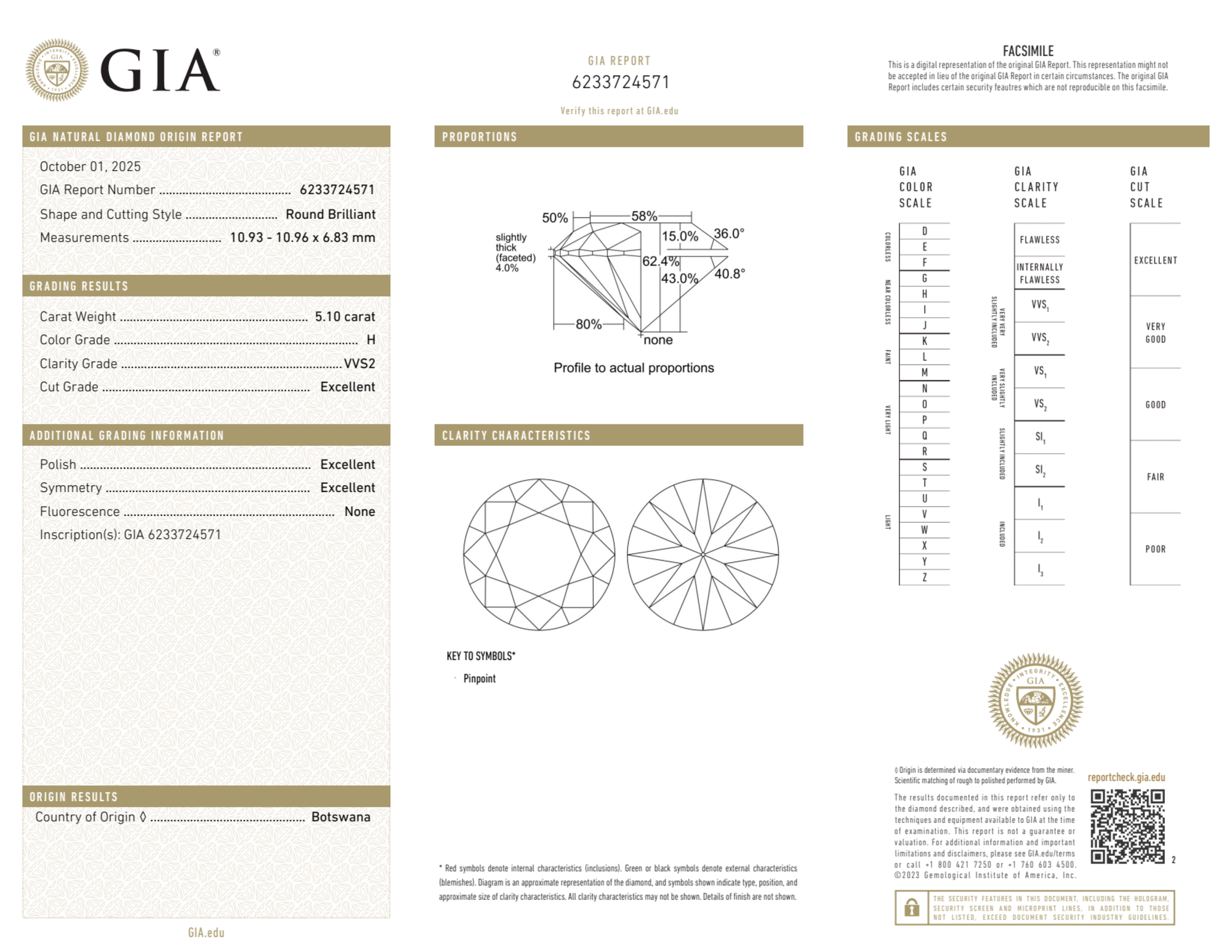Your 5.10 carat Round natural diamond is graded H color (Near Colorless), and you can read more about H color diamonds here.