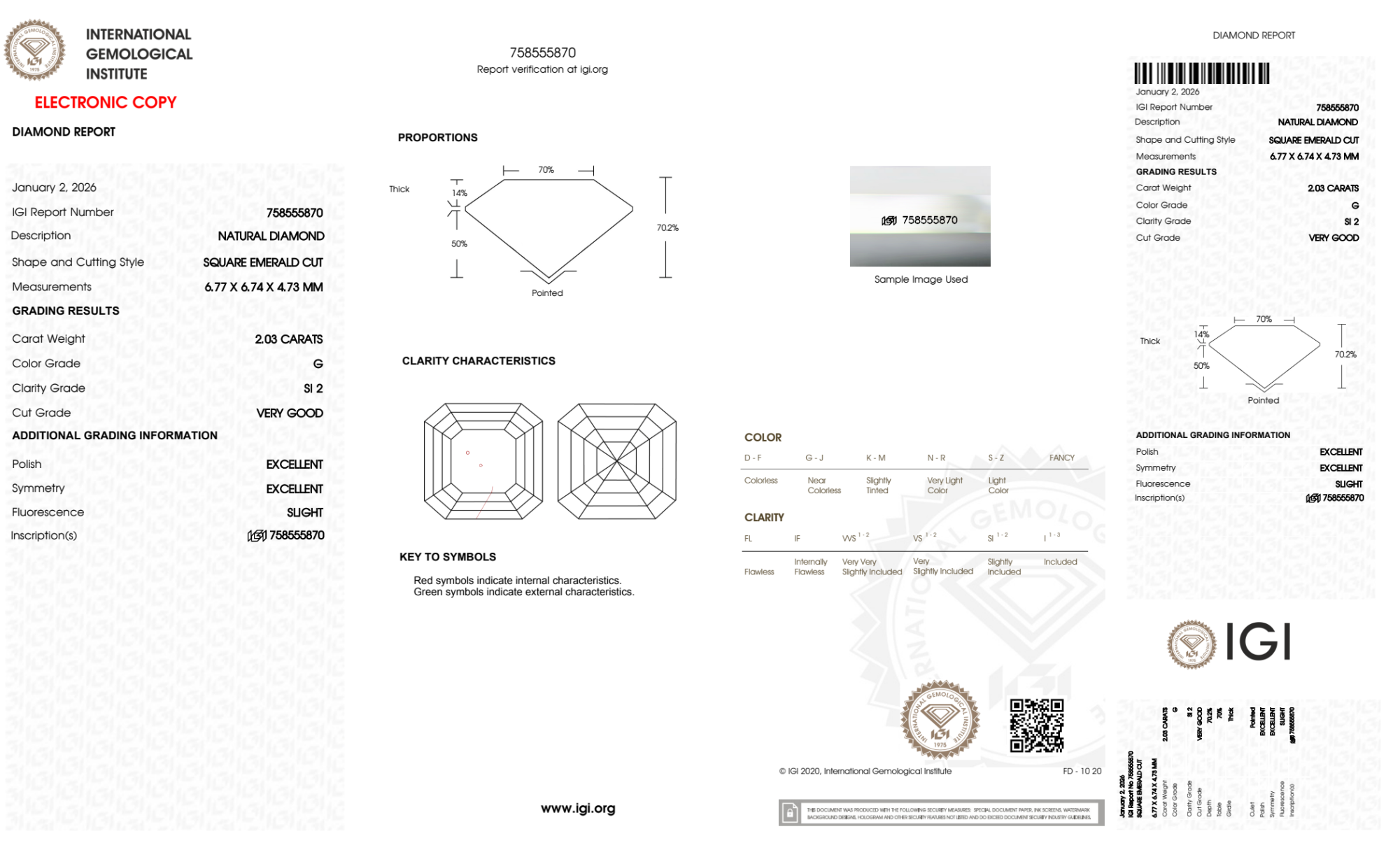 Your 2.03 carat Asscher natural diamond is graded G color (Near Colorless), and you can read more about G color diamonds here.