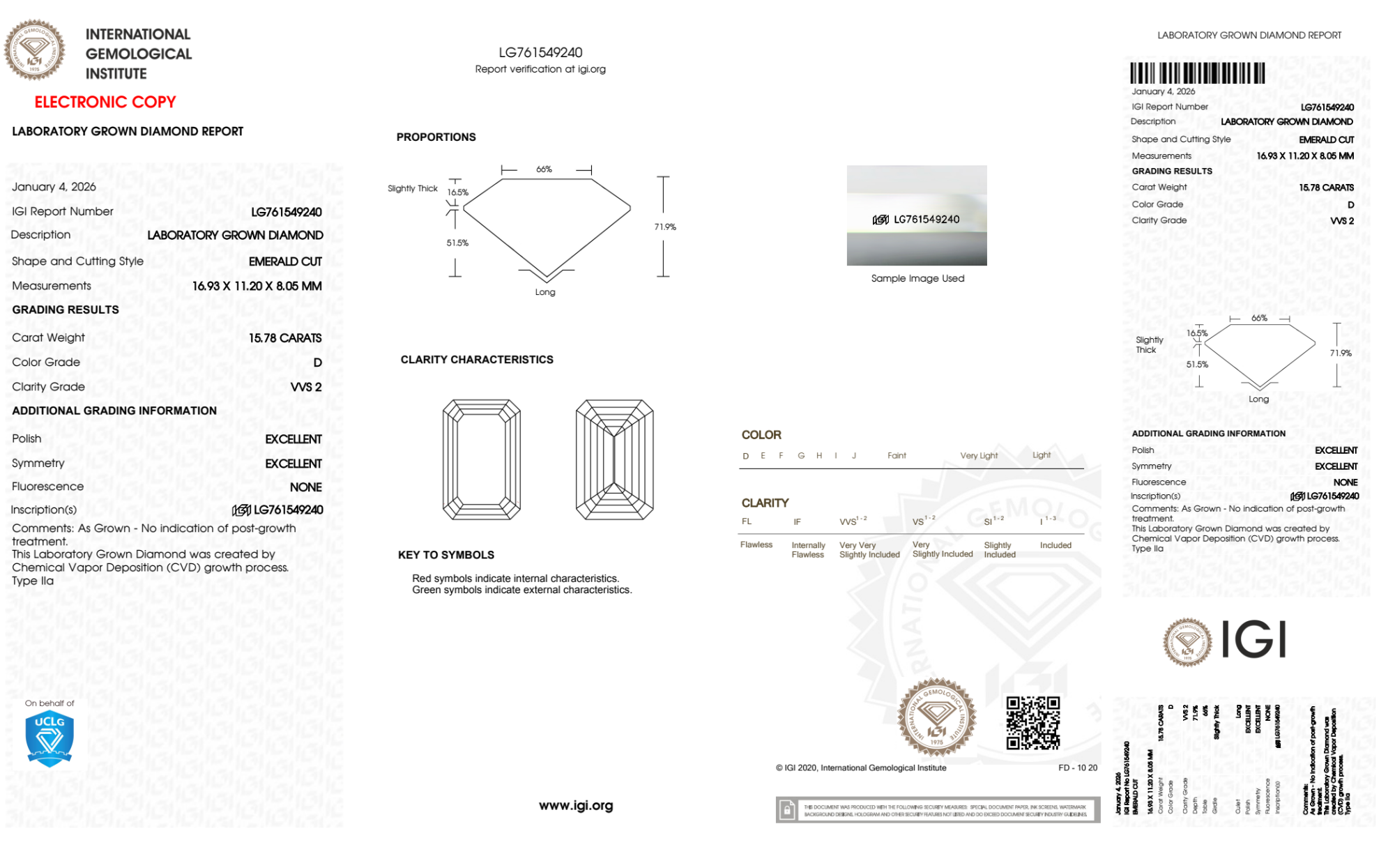 Your 15.78 carat Emerald lab diamond is graded D color (Colorless), and you can read more about D color diamonds here.