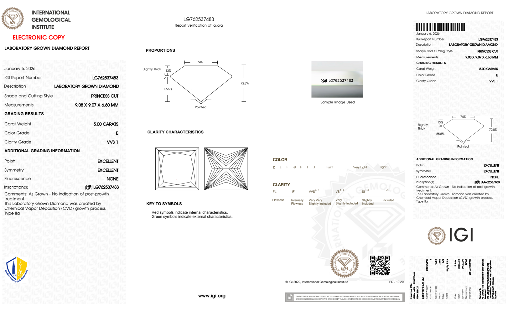 Your 5.00 carat Princess lab diamond is graded E color (Colorless), and you can read more about E color diamonds here.