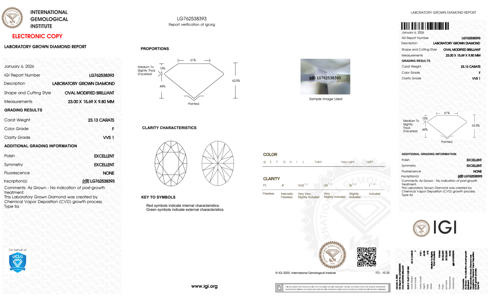 Your 23.13 carat Oval lab diamond is graded F color (Colorless), and you can read more about F color diamonds here.