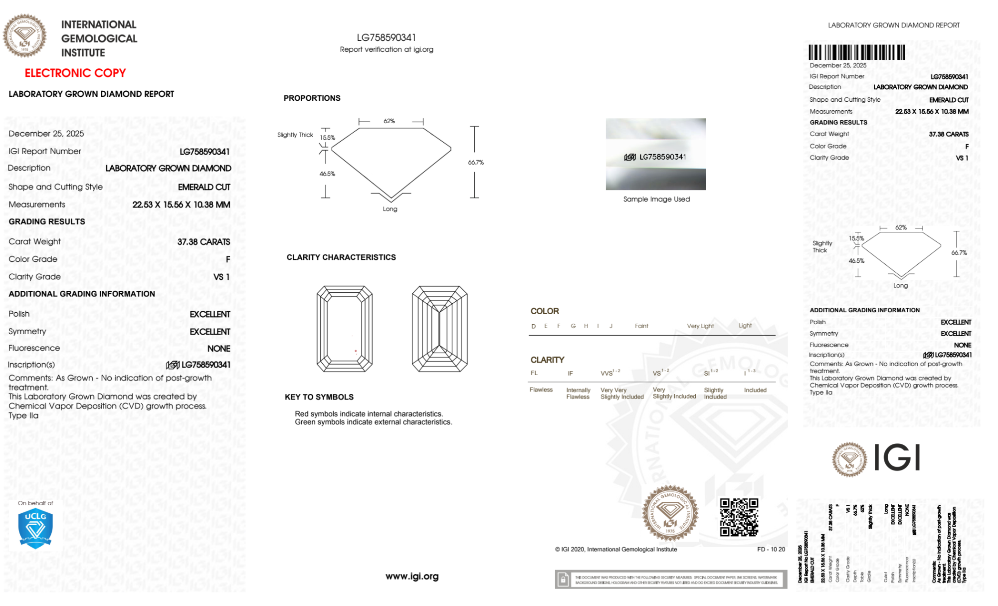 Your 37.38 carat Emerald lab diamond is graded F color (Colorless), and you can read more about F color diamonds here.