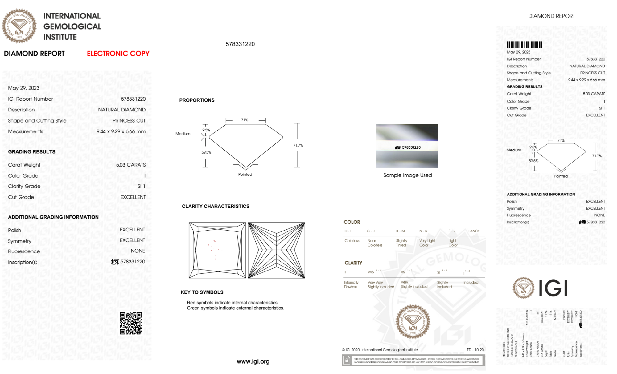 Your 5.03 carat Princess natural diamond is graded SI1 clarity, which stands for Slightly Included 1. Read more about SI1 clarity diamonds here, or learn more about diamond clarity in general here.