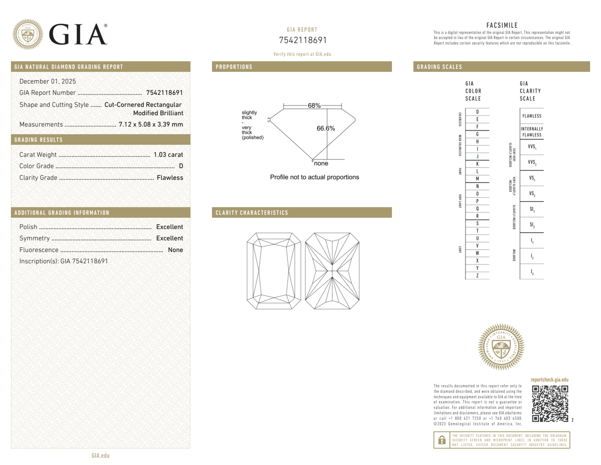 Your 1.03 carat Radiant natural diamond is graded D color (Colorless), and you can read more about D color diamonds here.