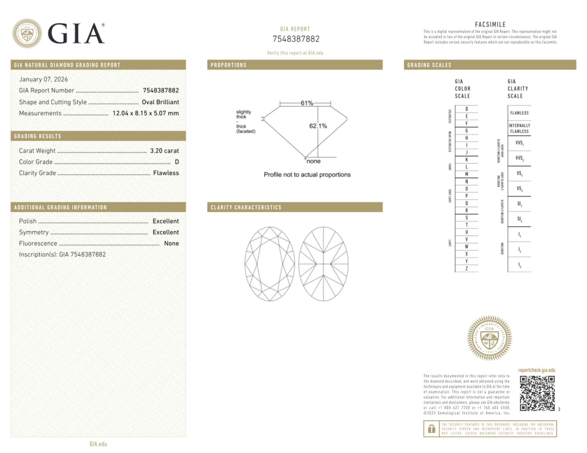 Your 3.20 carat Oval natural diamond is graded FL clarity, which stands for Flawless. Read more about FL clarity diamonds here, or learn more about diamond clarity in general here.