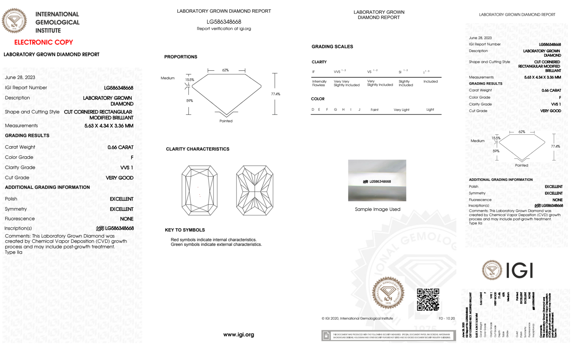 Your 0.66 carat Radiant lab diamond is graded F color (Colorless), and you can read more about F color diamonds here.