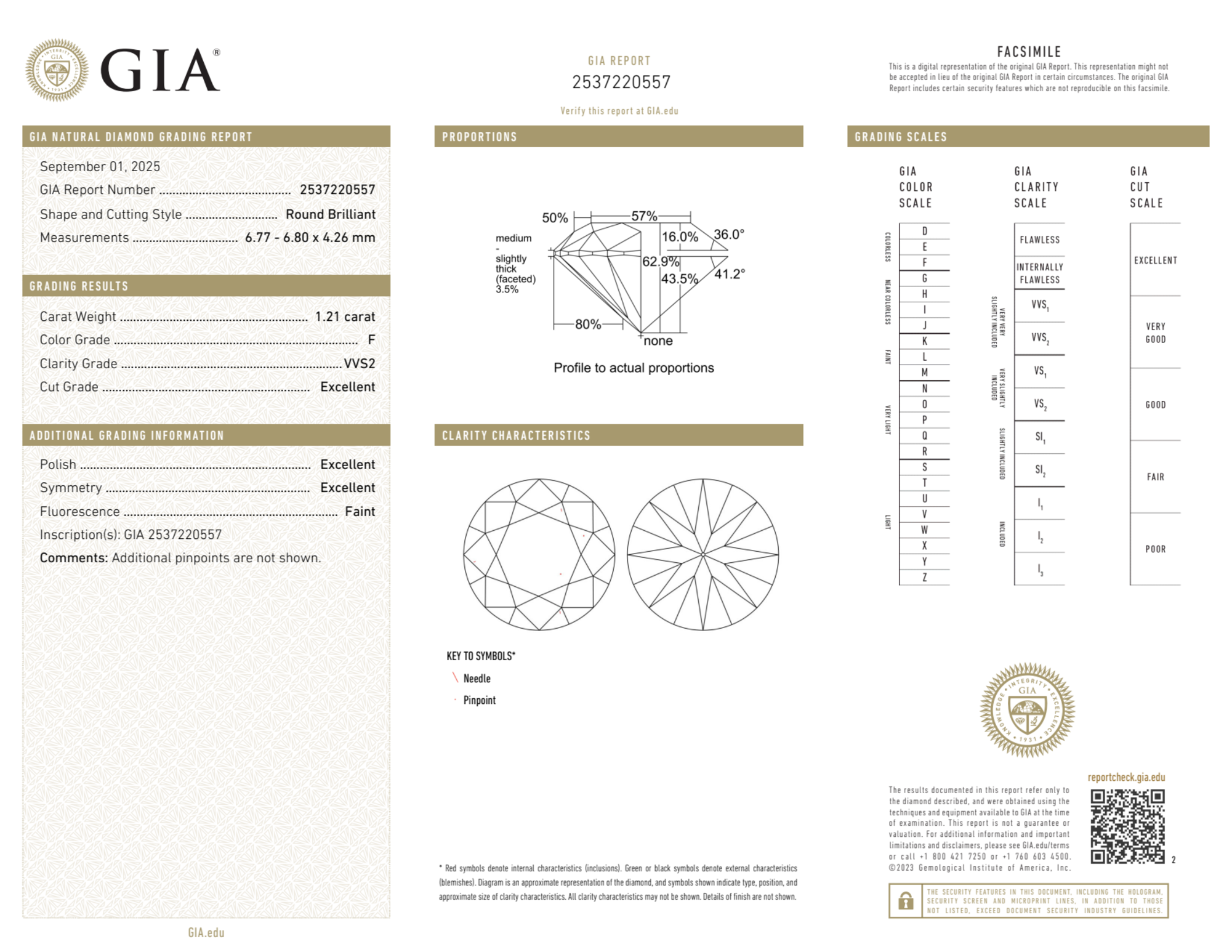 Your 1.21 carat Round natural diamond is graded F color (Colorless), and you can read more about F color diamonds here.