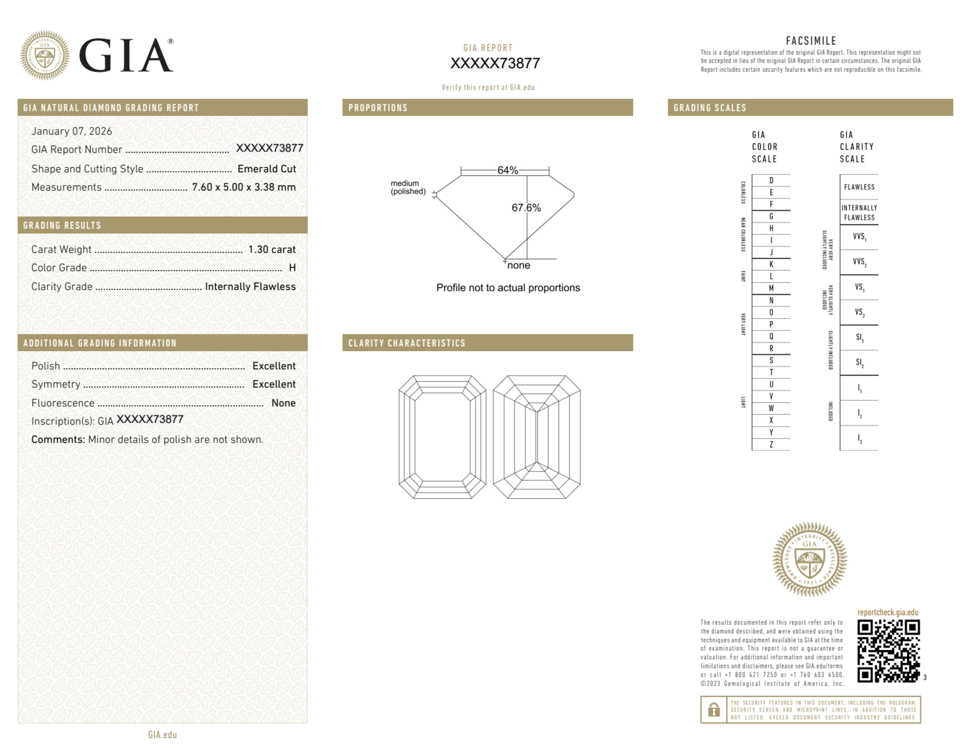 Your 1.30 carat Emerald natural diamond is graded IF clarity, which stands for Internally Flawless. Read more about IF clarity diamonds here, or learn more about diamond clarity in general here.