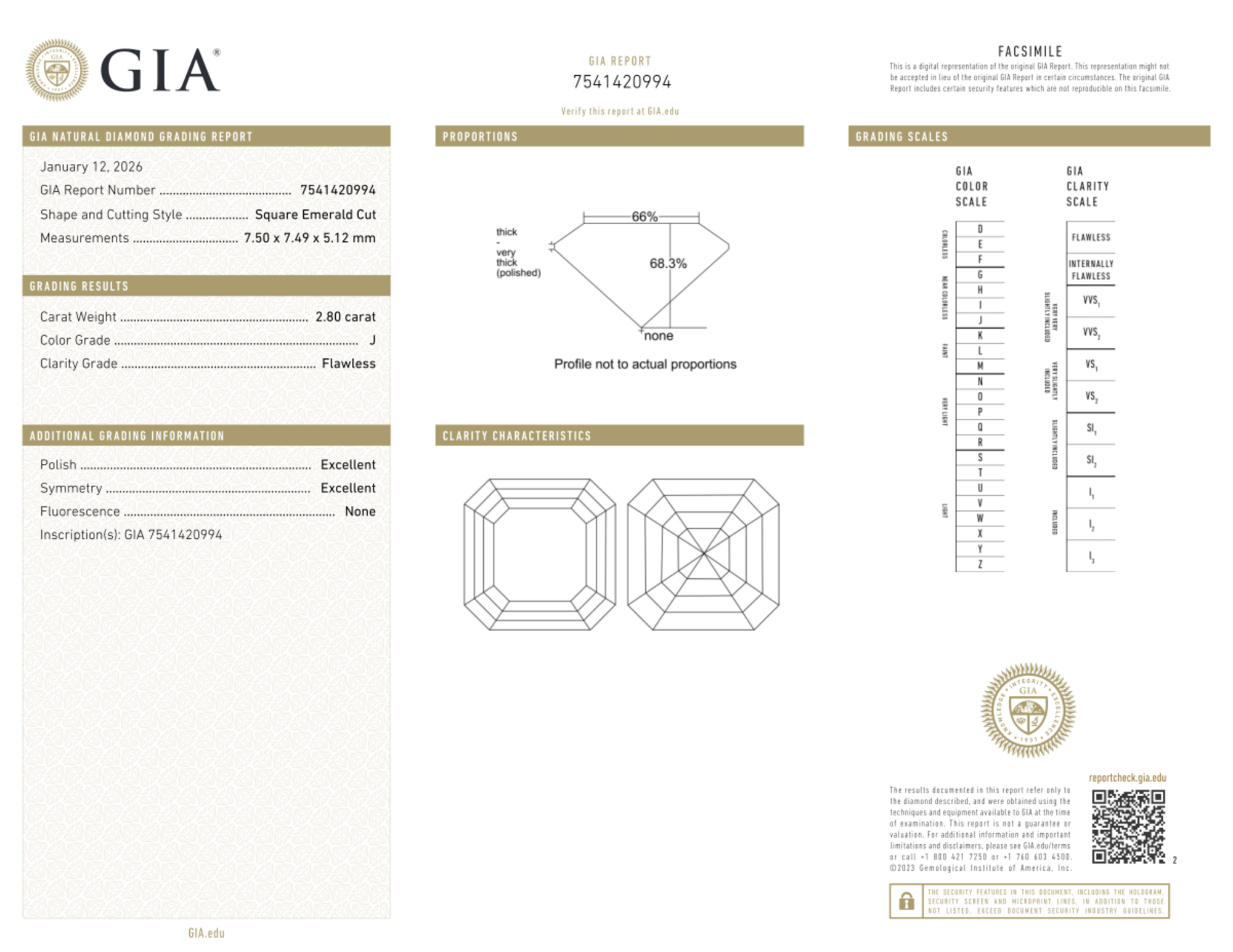 Your 2.80 carat Asscher natural diamond is graded FL clarity, which stands for Flawless. Read more about FL clarity diamonds here, or learn more about diamond clarity in general here.