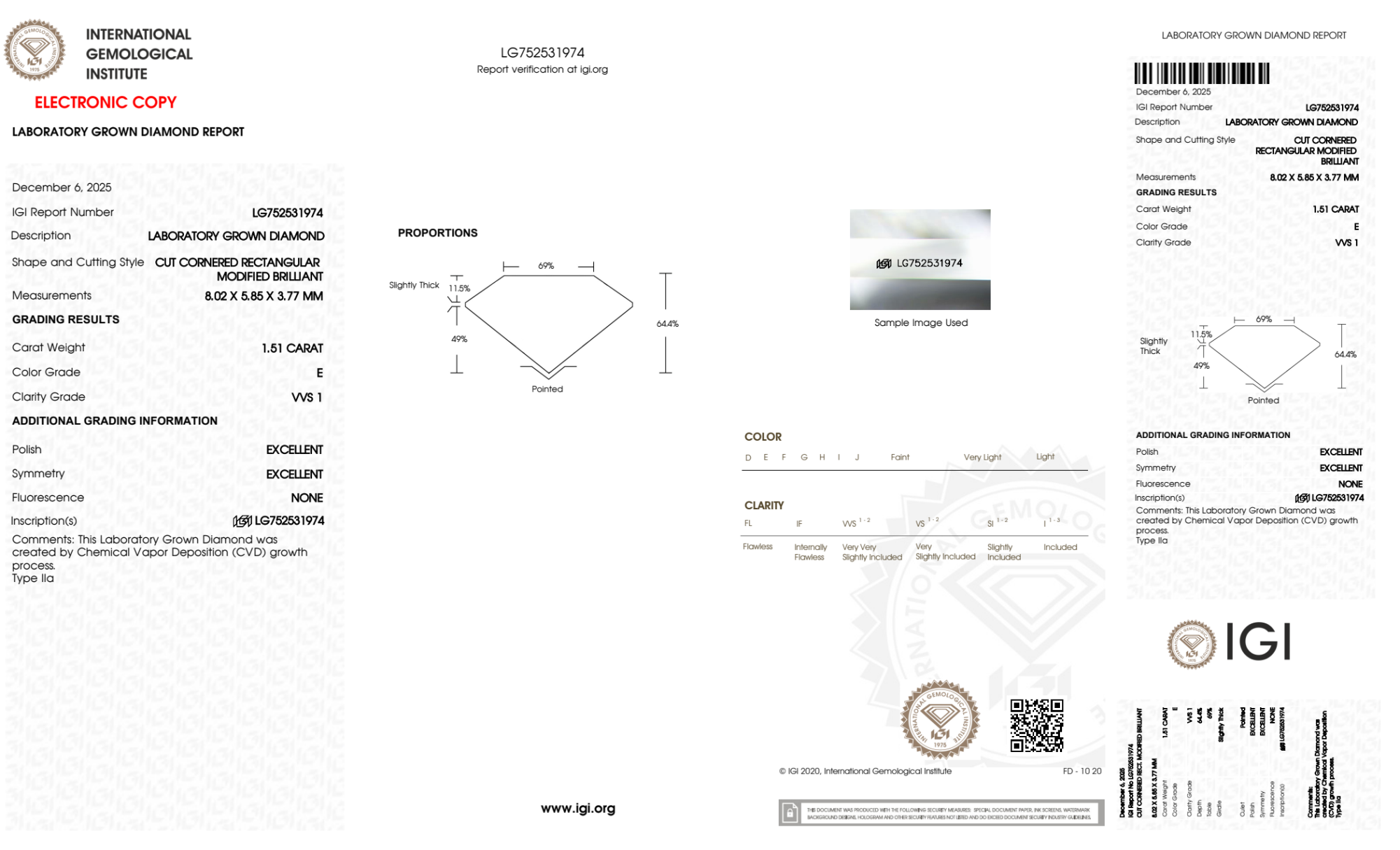 Your 1.51 carat Radiant lab diamond is graded E color (Colorless), and you can read more about E color diamonds here.