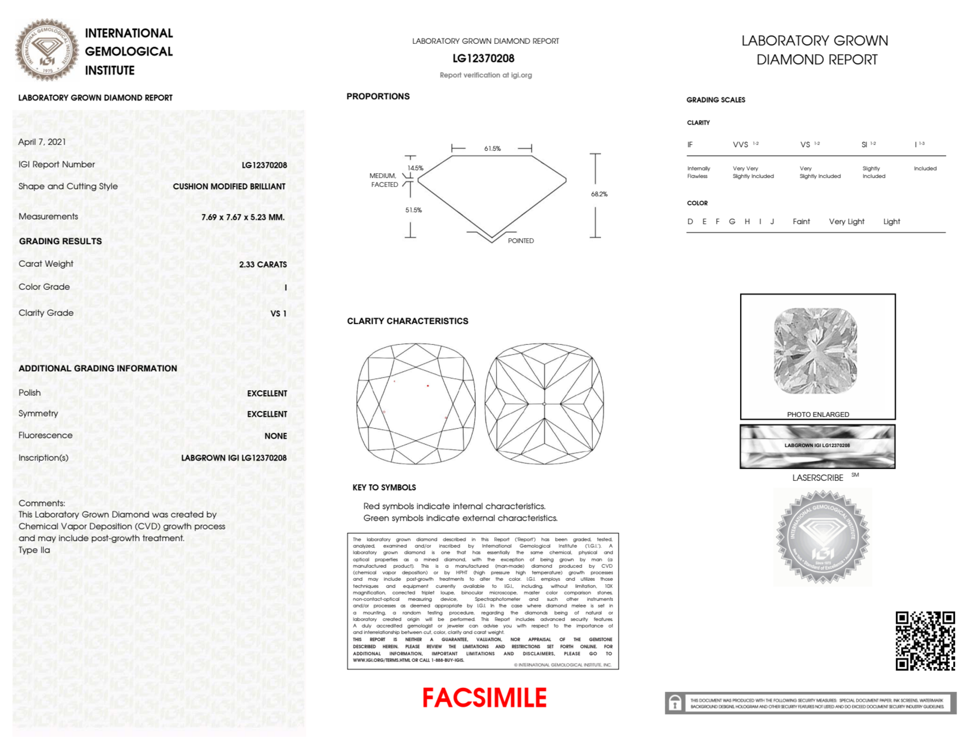 Your 2.33 carat Cushion lab diamond is graded VS1 clarity, which stands for Very Slightly Included 1. Read more about VS1 clarity diamonds here, or learn more about diamond clarity in general here.