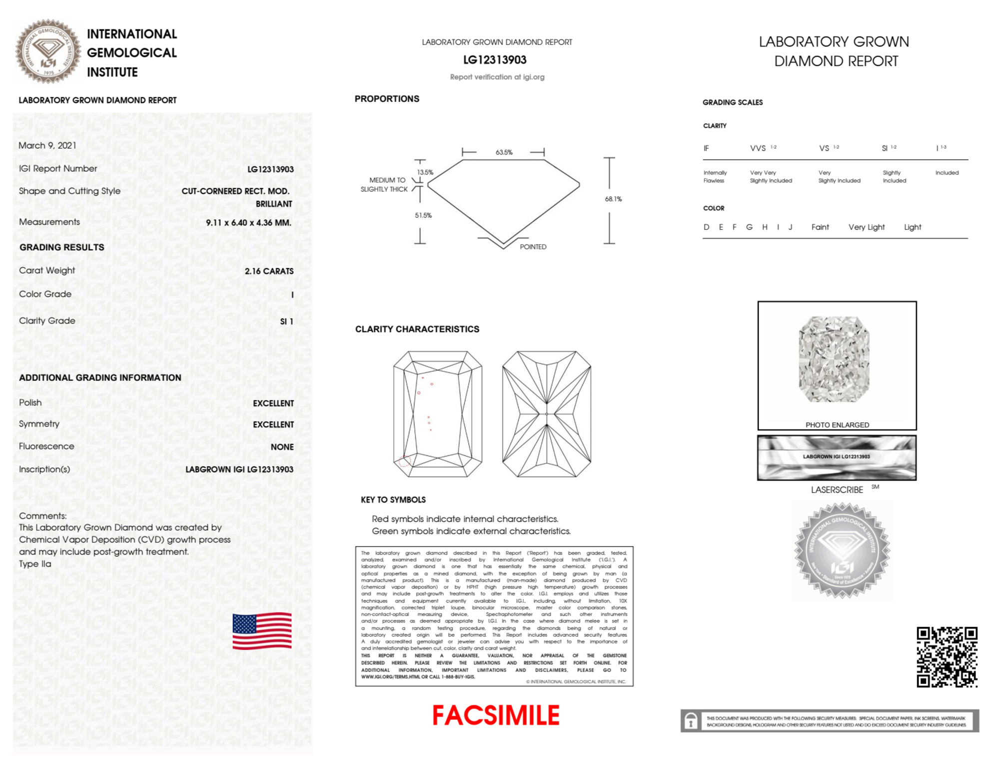 Your 2.16 carat Radiant lab diamond is graded SI1 clarity, which stands for Slightly Included 1. Read more about SI1 clarity diamonds here, or learn more about diamond clarity in general here.