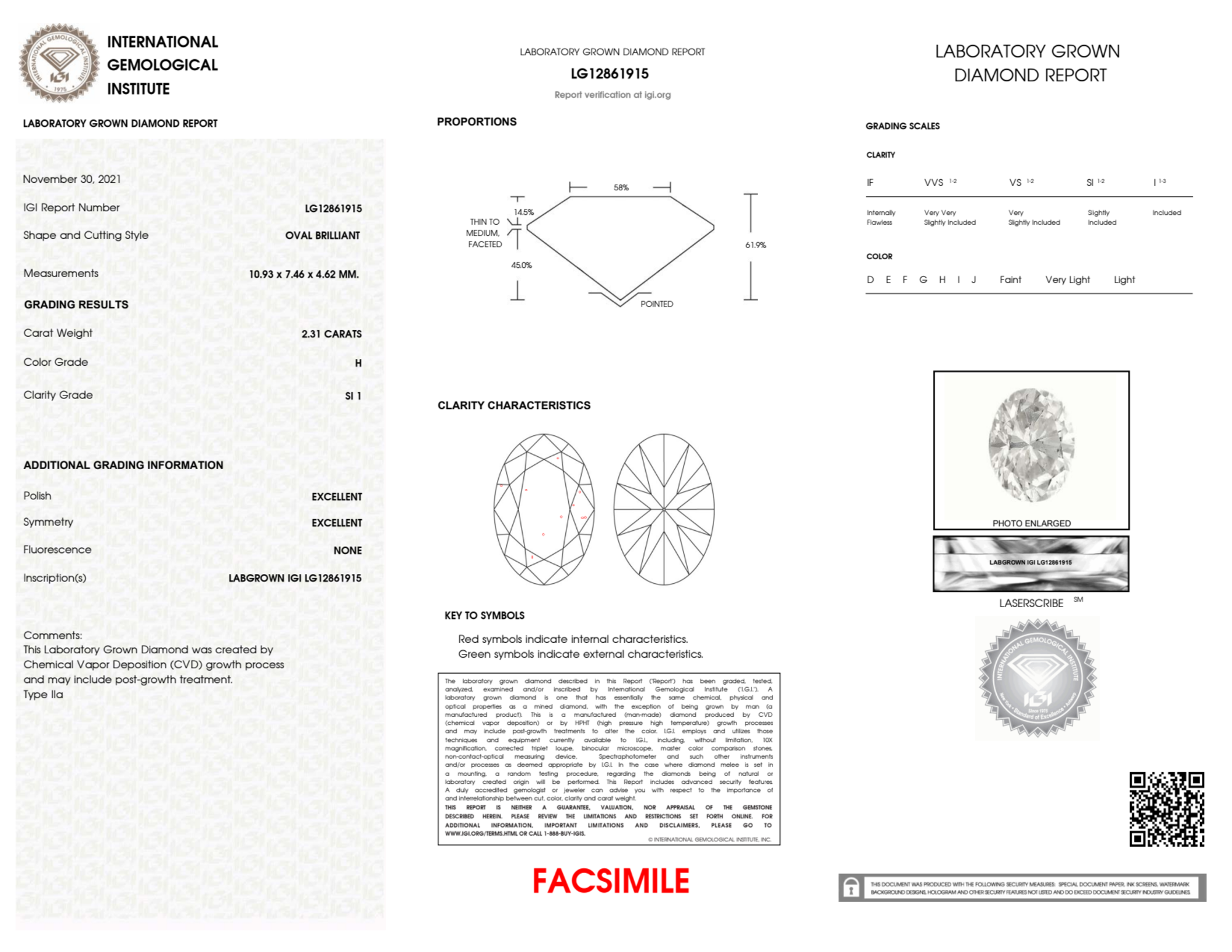 Your 2.31 carat Oval lab diamond is graded SI1 clarity, which stands for Slightly Included 1. Read more about SI1 clarity diamonds here, or learn more about diamond clarity in general here.