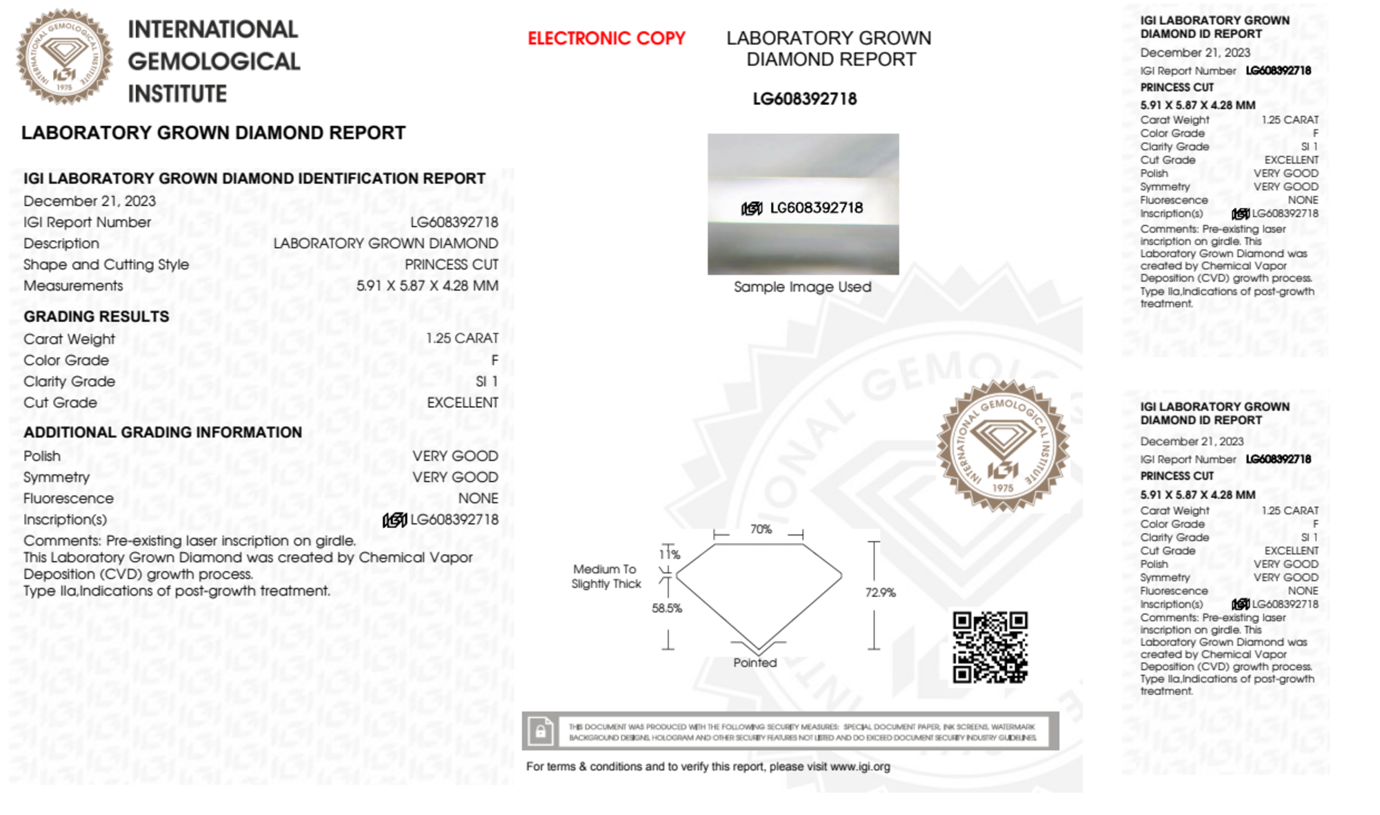 Your 1.25 carat Princess lab diamond is graded F color (Colorless), and you can read more about F color diamonds here.