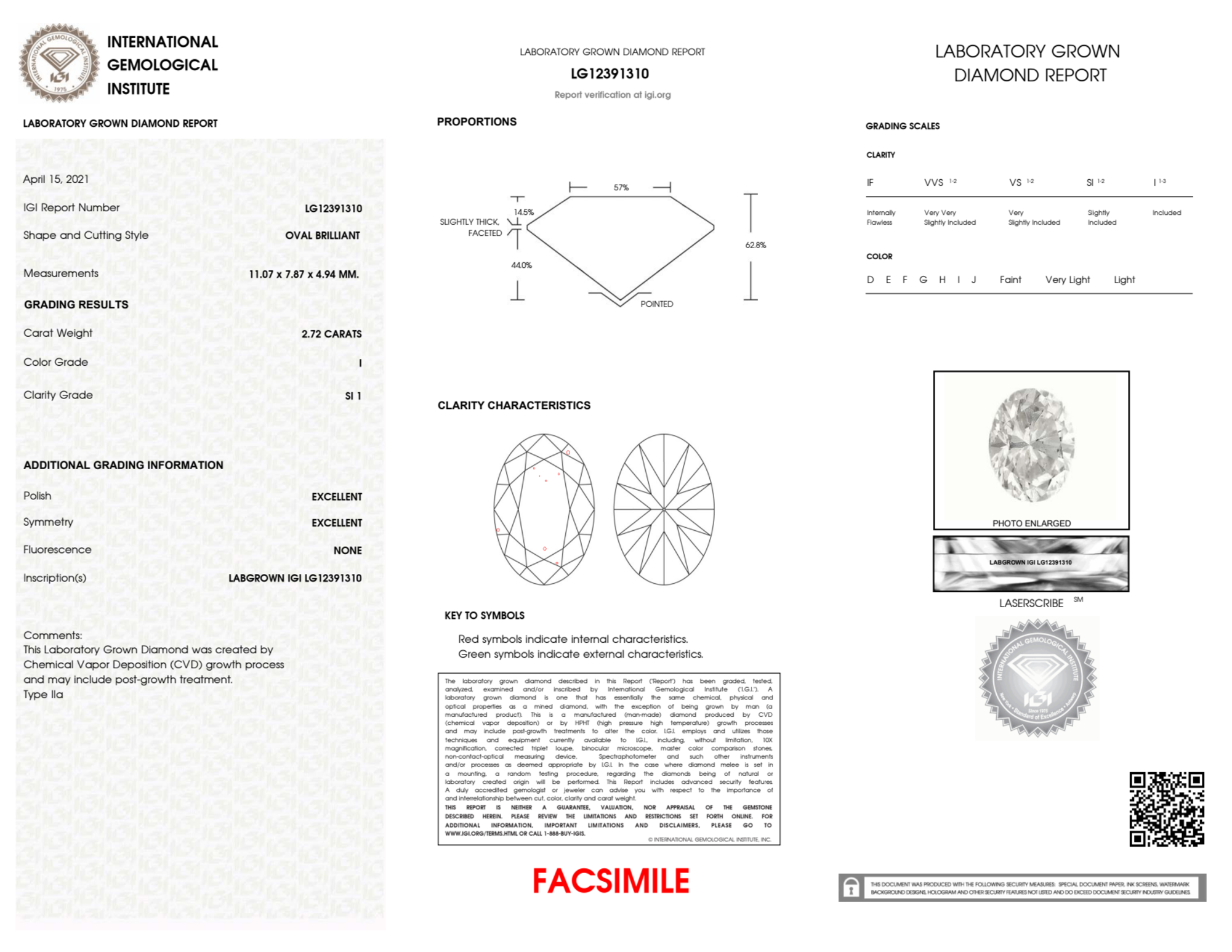 Your 2.72 carat Oval lab diamond is graded SI1 clarity, which stands for Slightly Included 1. Read more about SI1 clarity diamonds here, or learn more about diamond clarity in general here.