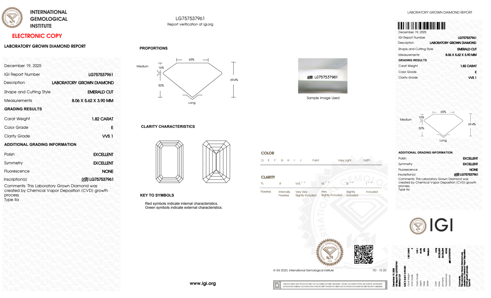 Your 1.82 carat Emerald lab diamond is graded E color (Colorless), and you can read more about E color diamonds here.