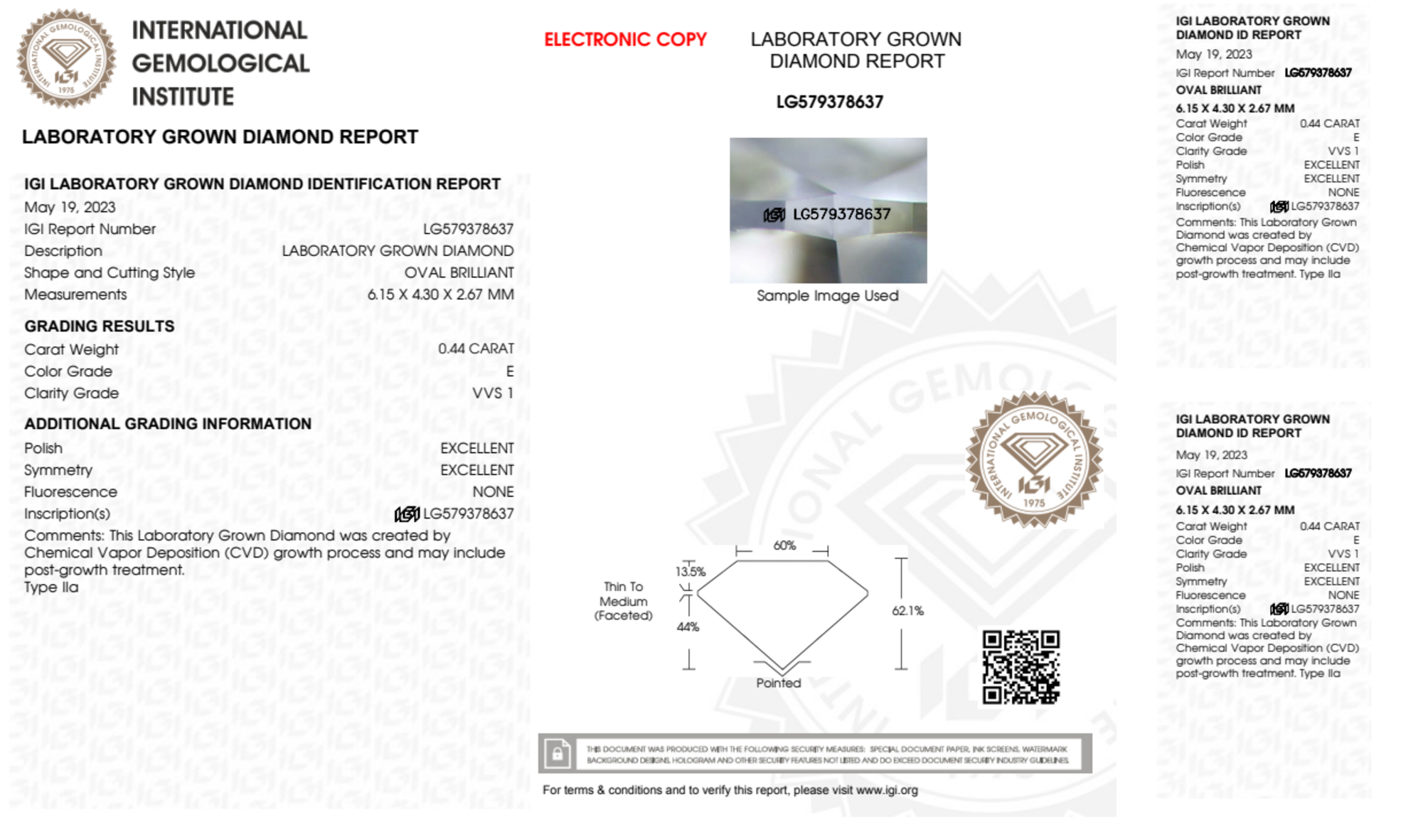 Your 0.44 carat Oval lab diamond is graded E color (Colorless), and you can read more about E color diamonds here.