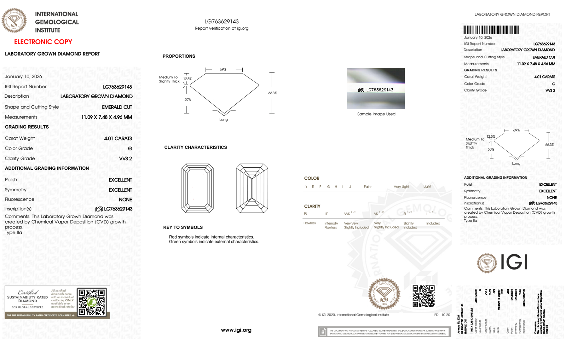 Your 4.01 carat Emerald lab diamond is graded G color (Near Colorless), and you can read more about G color diamonds here.