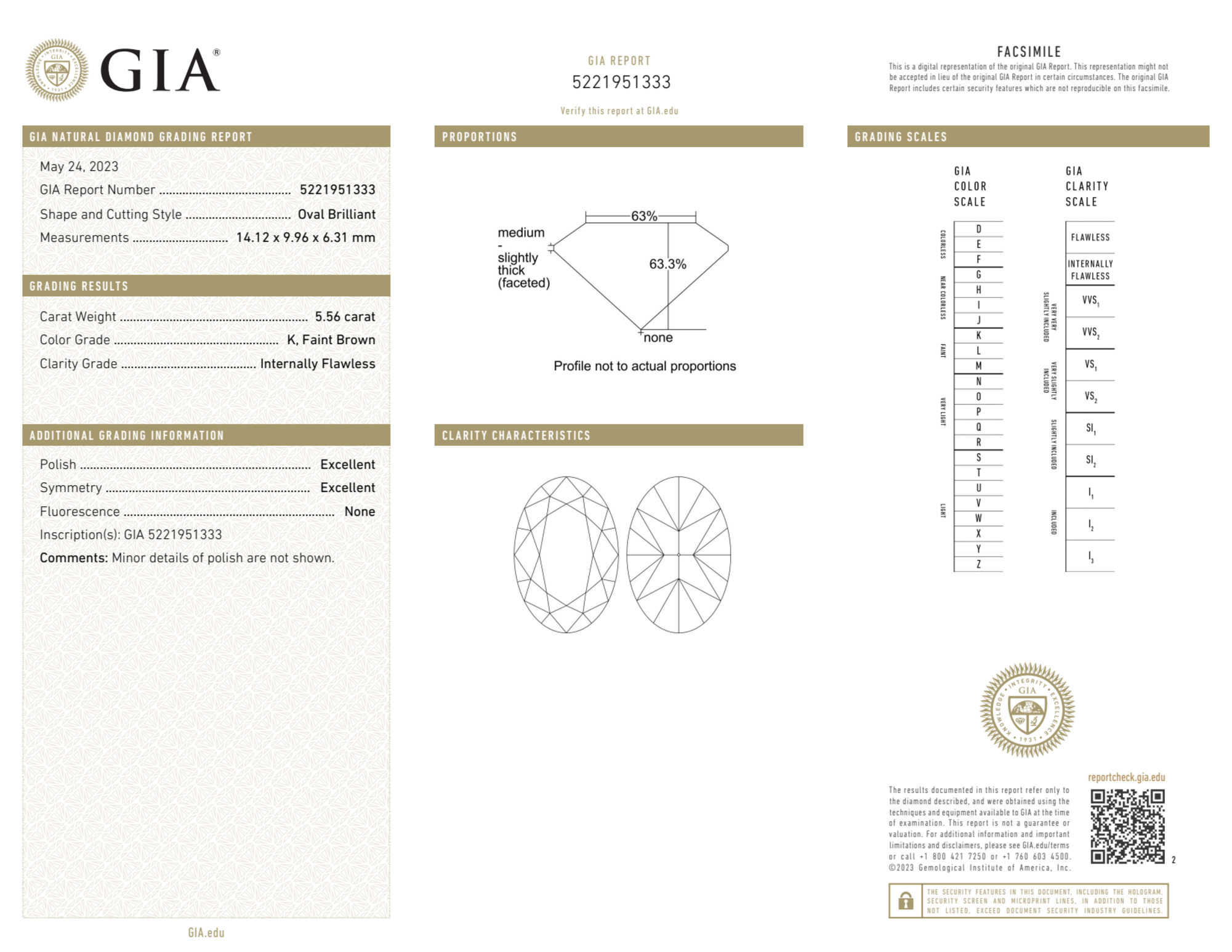 Your 5.56 carat Oval natural diamond is graded IF clarity, which stands for Internally Flawless. Read more about IF clarity diamonds here, or learn more about diamond clarity in general here.