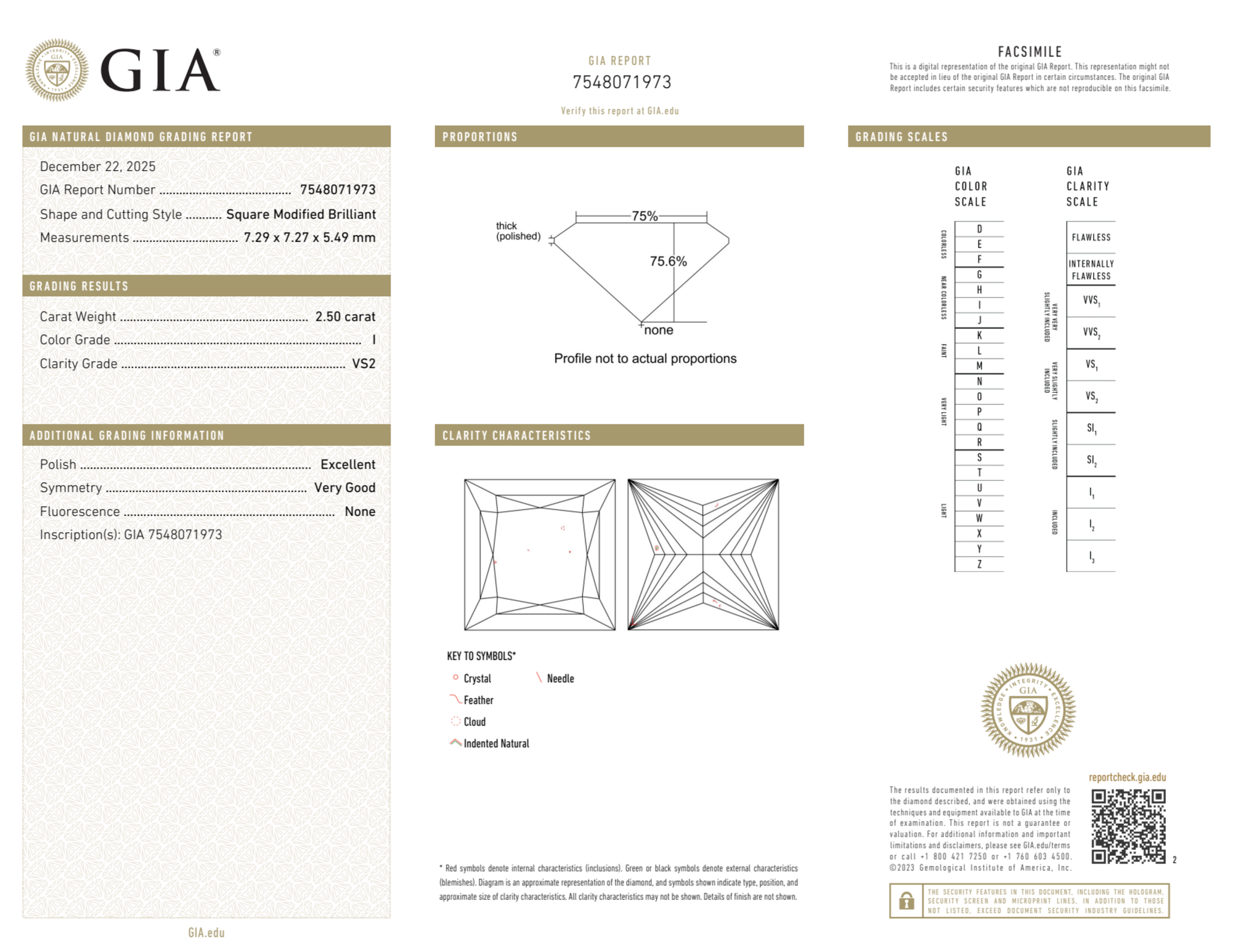 Your 2.50 carat Princess natural diamond is graded VS2 clarity, which stands for Very Slightly Included 2. Read more about VS2 clarity diamonds here, or learn more about diamond clarity in general here.