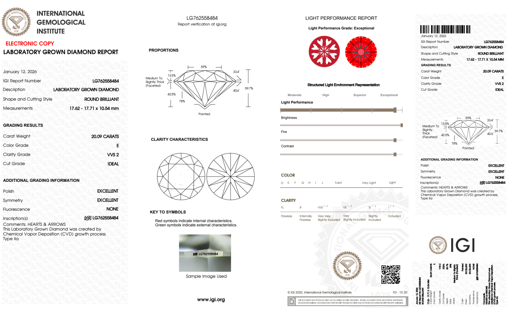Your 20.09 carat Round lab diamond is graded E color (Colorless), and you can read more about E color diamonds here.
