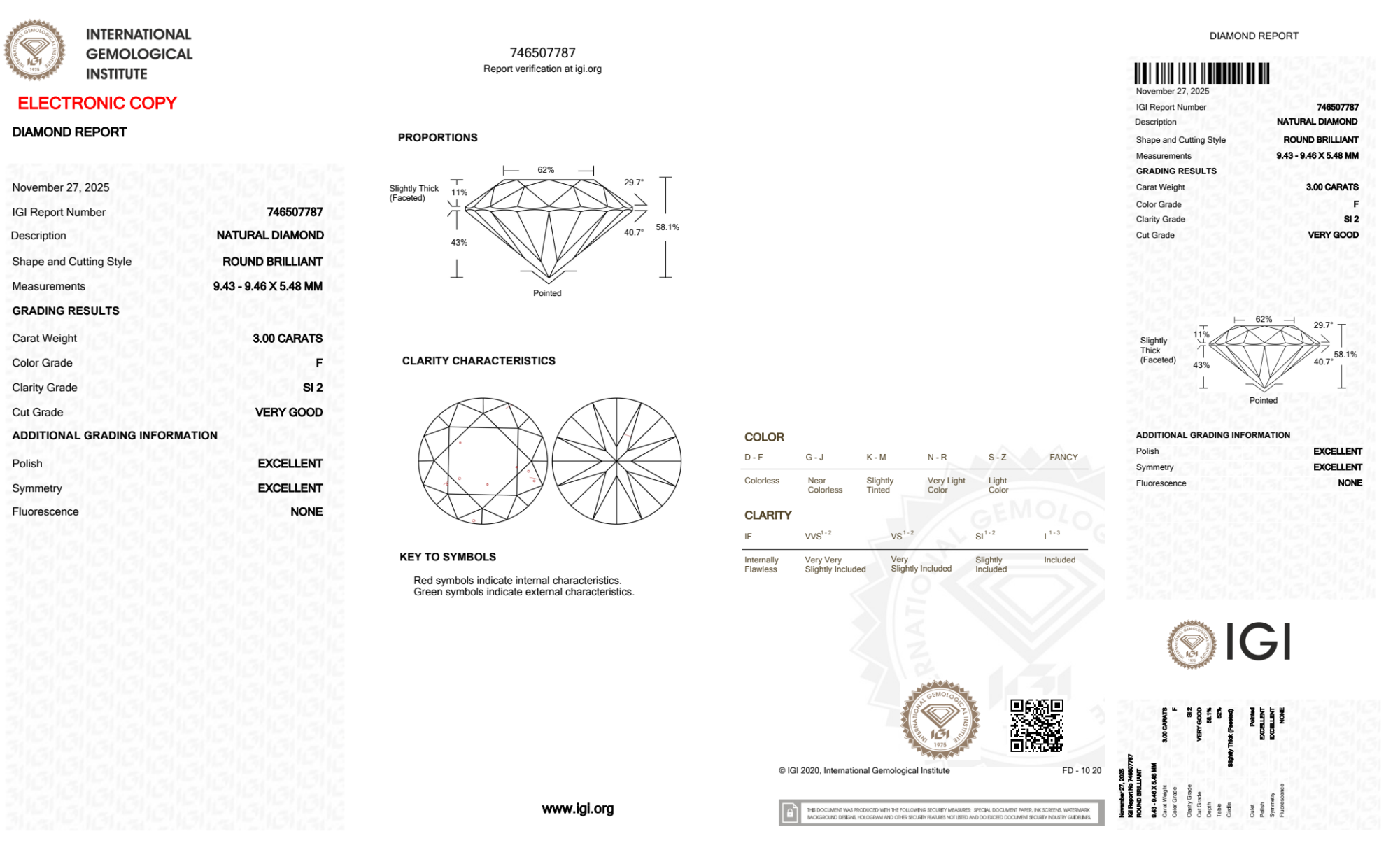Your 3.00 carat Round natural diamond is graded SI2 clarity, which stands for Slightly Included 2. Read more about SI2 clarity diamonds here, or learn more about diamond clarity in general here.