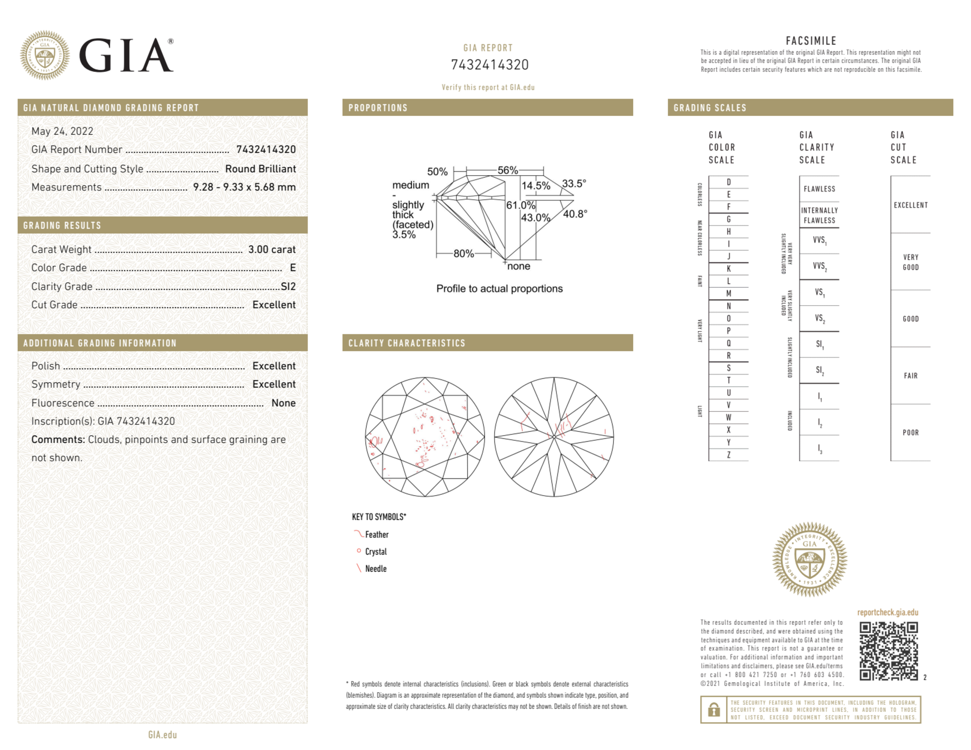 Your 3.00 carat Round natural diamond is graded SI2 clarity, which stands for Slightly Included 2. Read more about SI2 clarity diamonds here, or learn more about diamond clarity in general here.