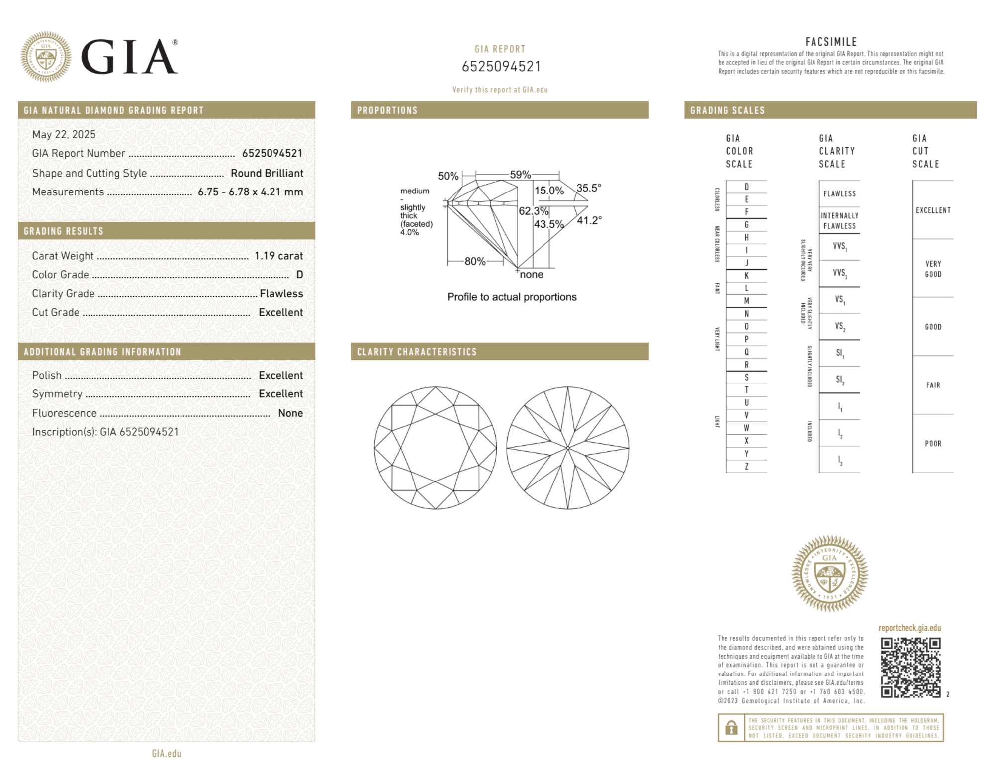Your 1.19 carat Round natural diamond is graded FL clarity, which stands for Flawless. Read more about FL clarity diamonds here, or learn more about diamond clarity in general here.