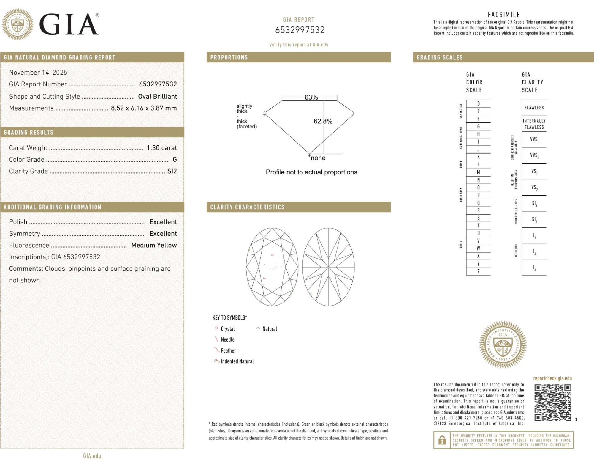 Your 1.30 carat Oval natural diamond is graded SI2 clarity, which stands for Slightly Included 2. Read more about SI2 clarity diamonds here, or learn more about diamond clarity in general here.