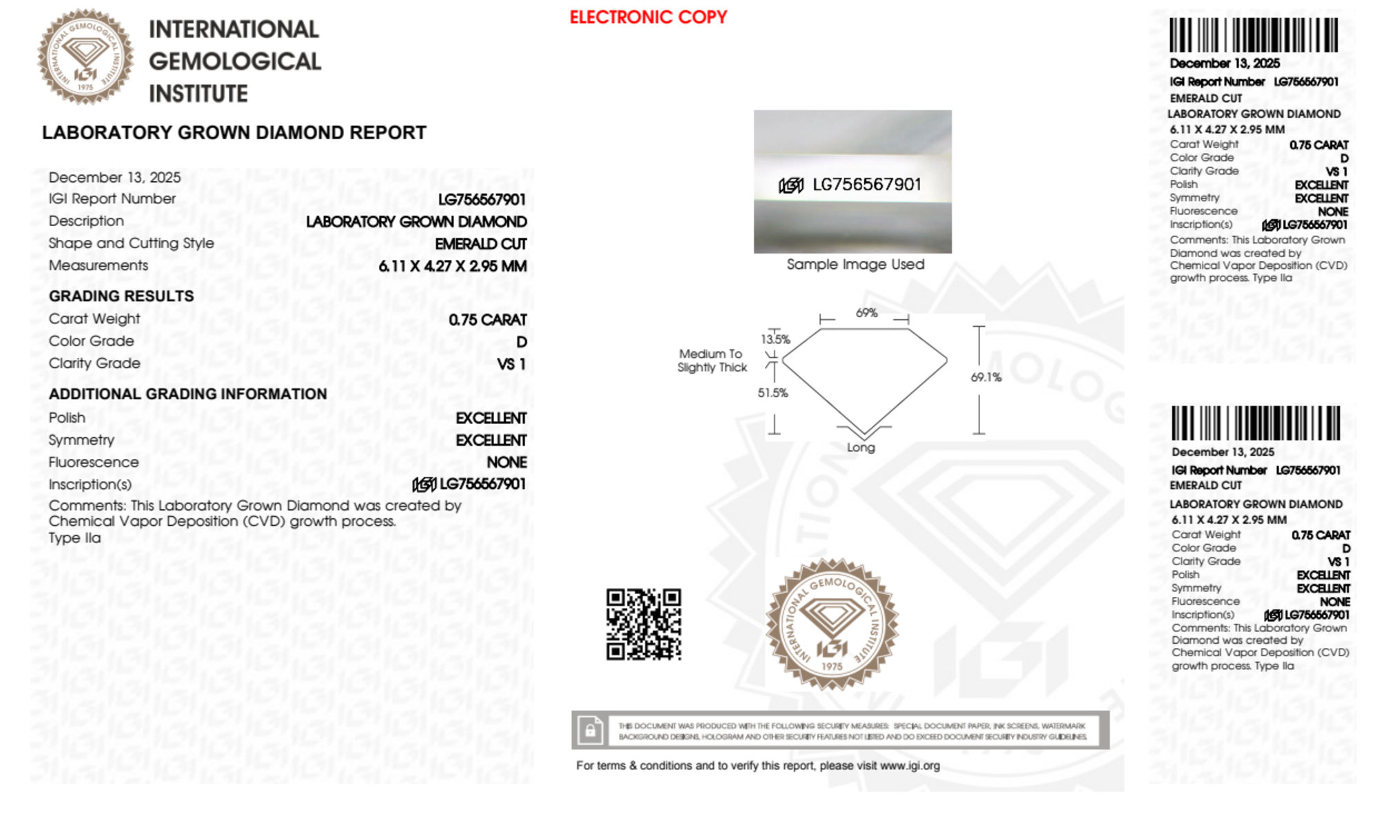 Your 0.75 carat Emerald lab diamond is graded D color (Colorless), and you can read more about D color diamonds here.