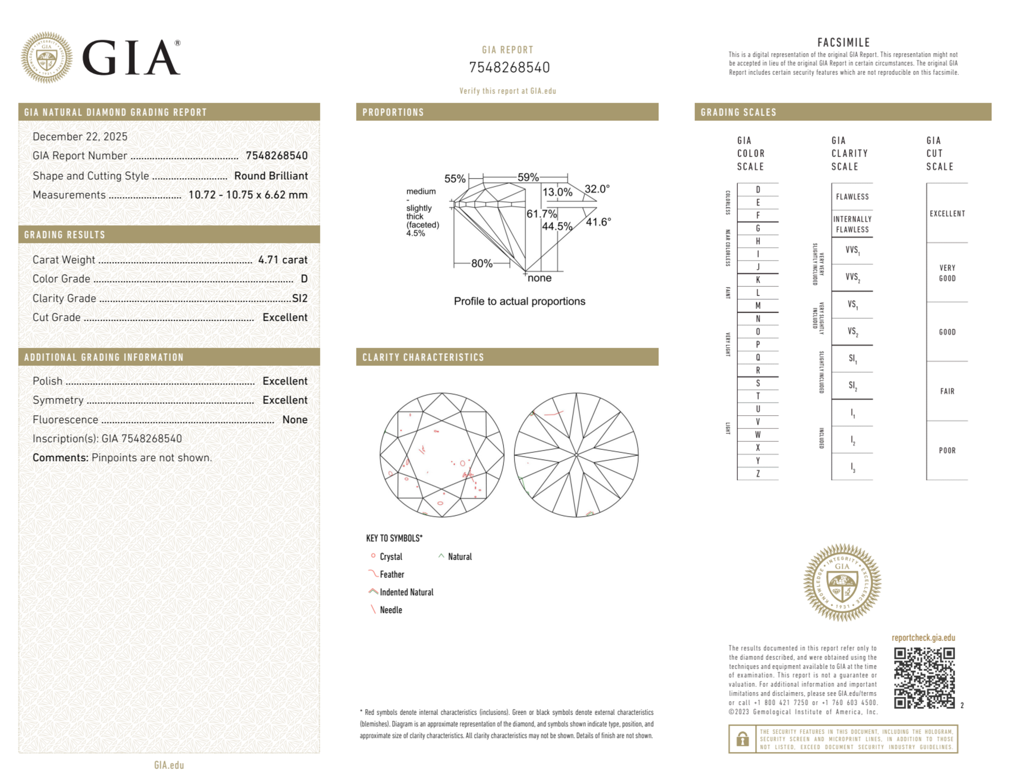 Your 4.71 carat Round natural diamond is graded SI2 clarity, which stands for Slightly Included 2. Read more about SI2 clarity diamonds here, or learn more about diamond clarity in general here.