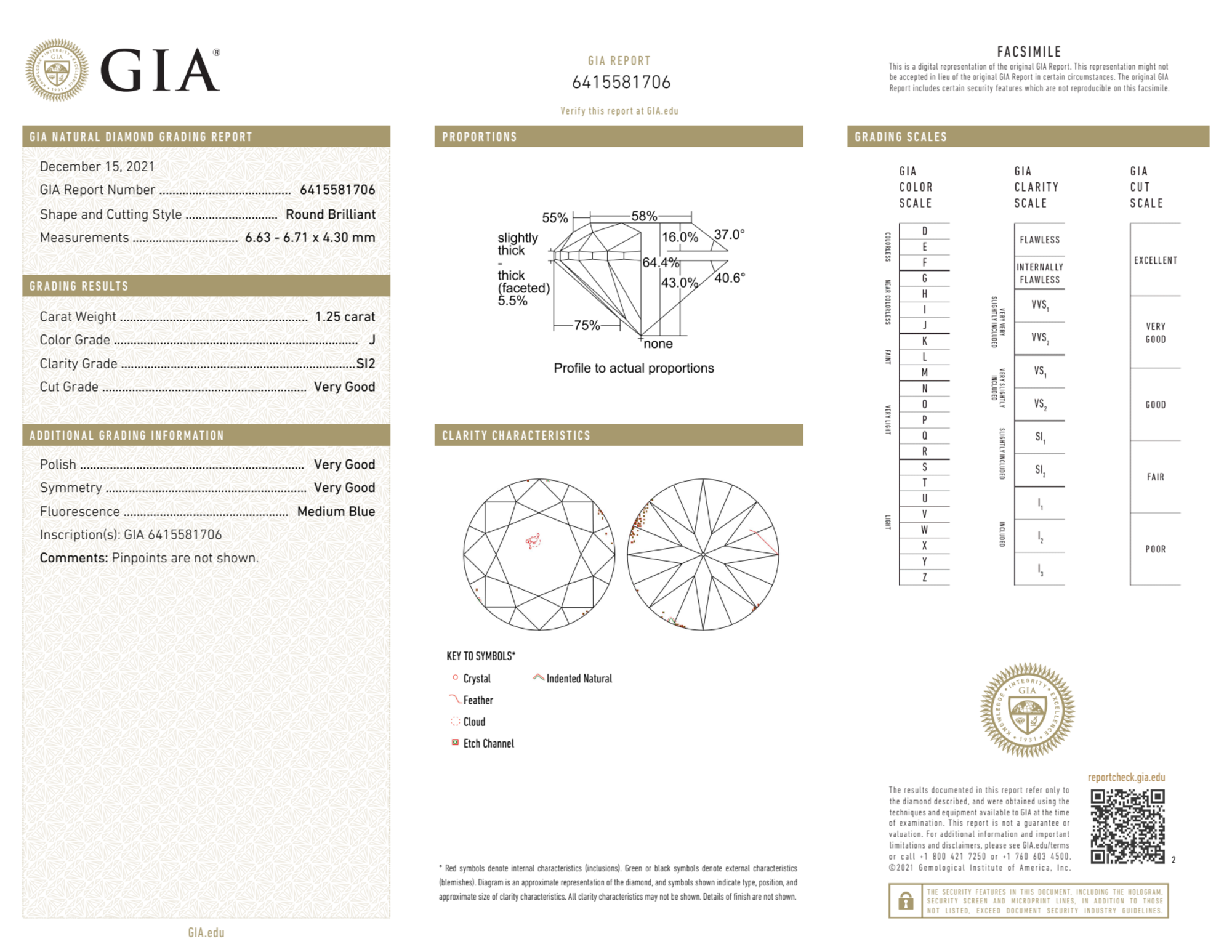 Your 1.25 carat Round natural diamond is graded J color (Near Colorless), and you can read more about J color diamonds here.