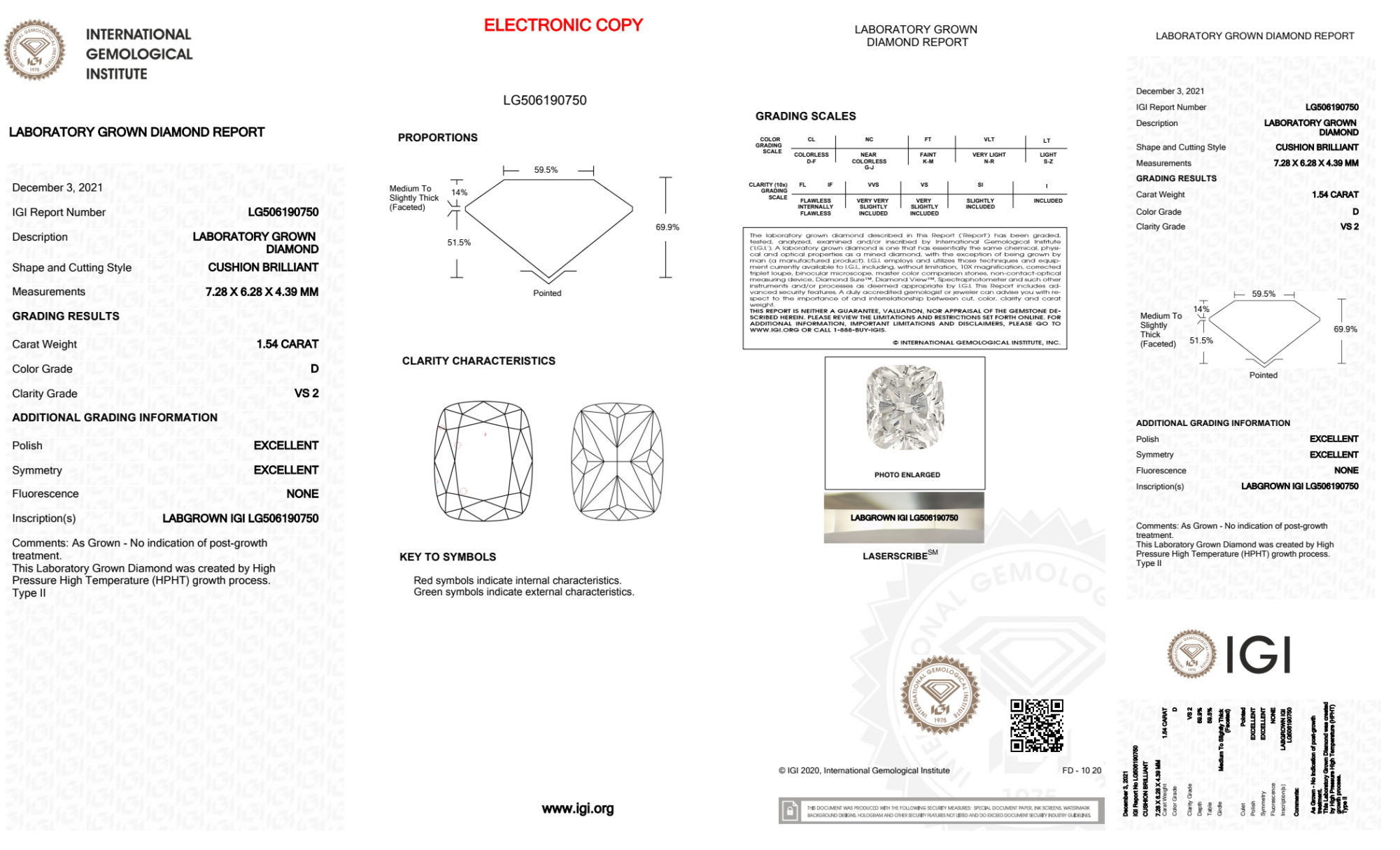Your 1.54 carat Cushion lab diamond is graded D color (Colorless), and you can read more about D color diamonds here.