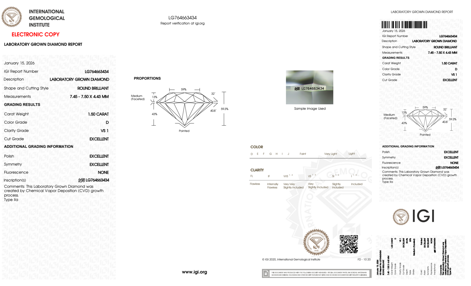 Your 1.50 carat Round lab diamond is graded D color (Colorless), and you can read more about D color diamonds here.